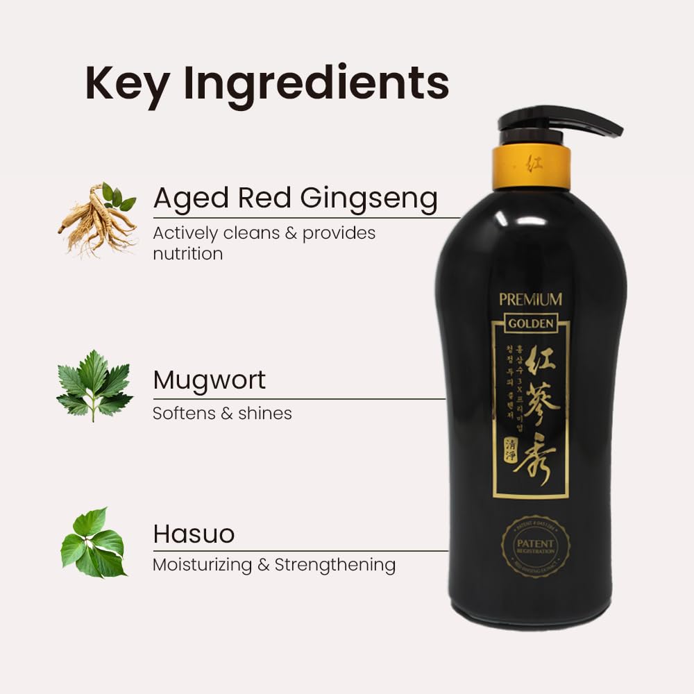 Red Ginseng 3X Premium Golden Shampoo 24.68 fl.oz (730ml) with a 6-year-aged Korean Red Ginseng revitalizes all Hair Types. It soothes itchy Scalp and strengthens thinning Hair [Naisture]