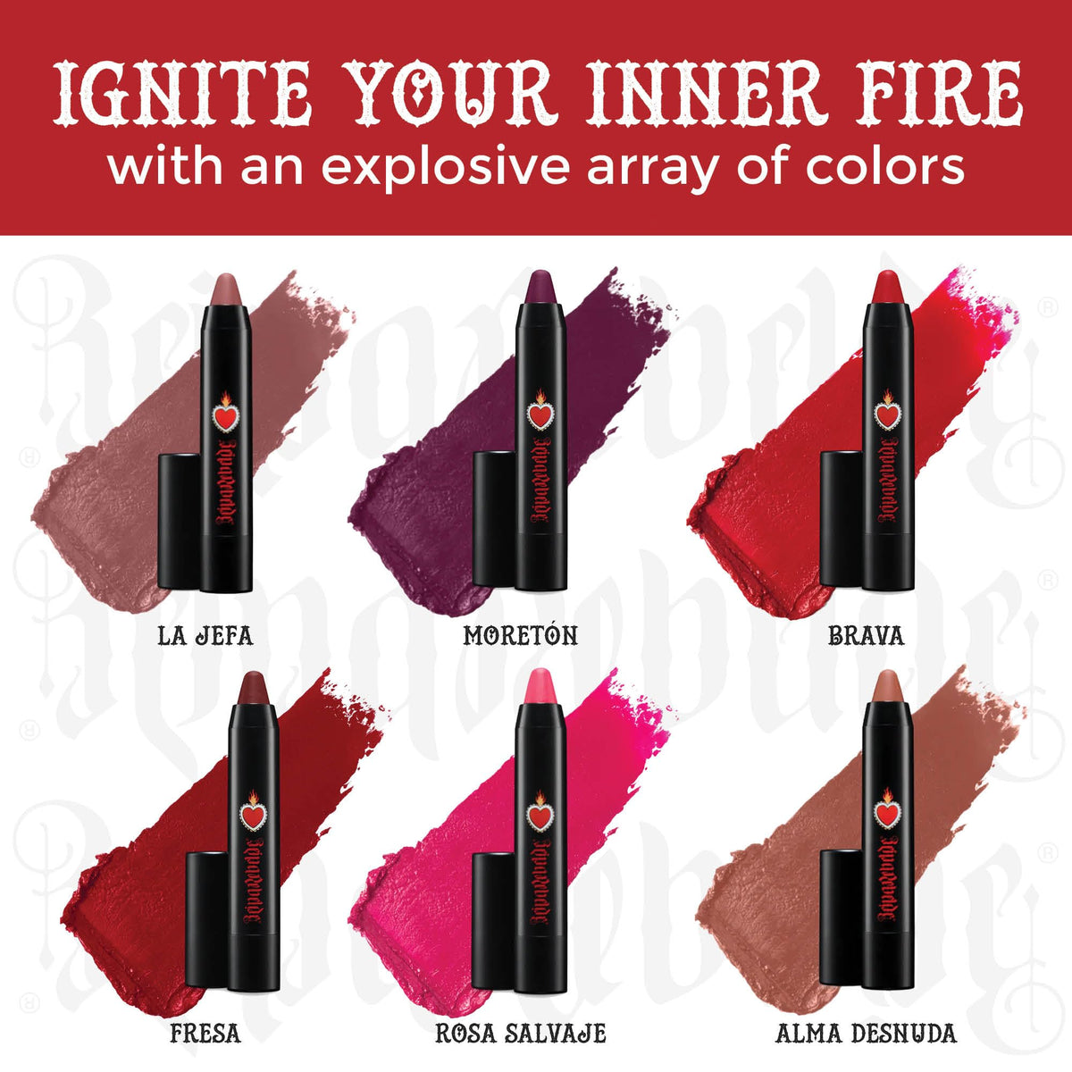 Add a bold pop of color to your lips with Reina Rebelde Fresa Bold Lip Color Stick in Deep Berry Red. This lipstick offers high pigmentation and a moisturizing formula for a satin finish.