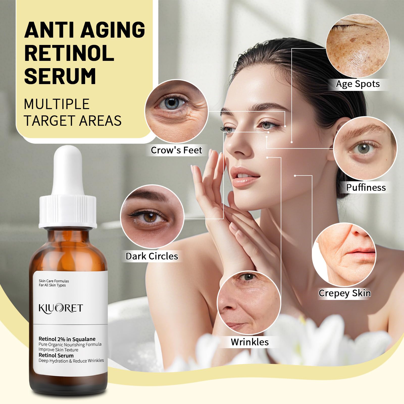 Retinol Serum for Face, 2% Retinol Serum with Squalane, Hyaluronic Acid, Vitamin E, Niacinamide for Anti-Aging, Wrinkles and Fine Lines, Improves Texture for All Skins, 30ml of 1 Pack
