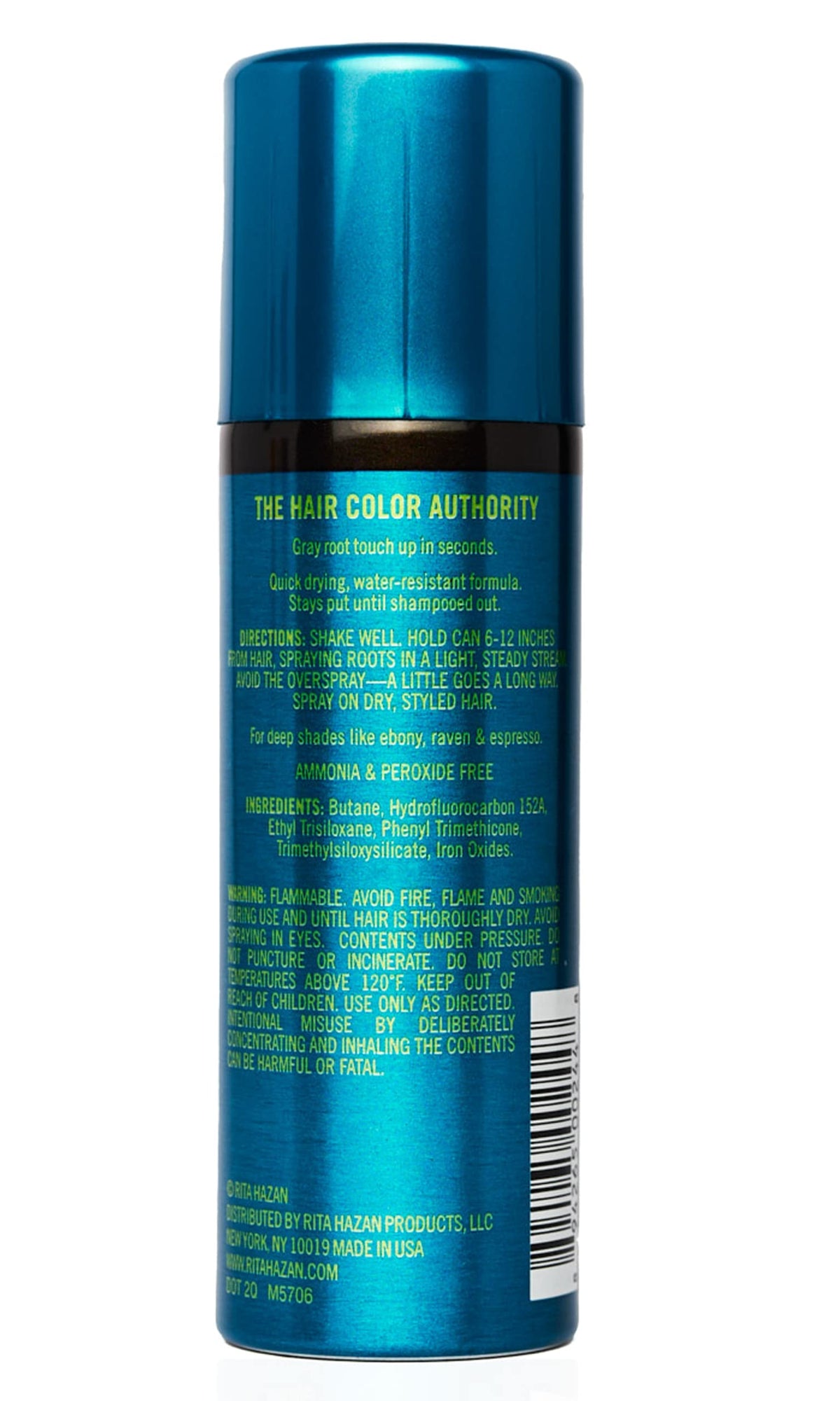 Ingredients: Custom blended color pigments designed by Rita to match every hair shade. Butane, Hydrofluorocarbon 152A, Ethyl Trisiloxane, Phenyl Trimethicone, Trimethylsiloxysilicate, Iron Oxides.