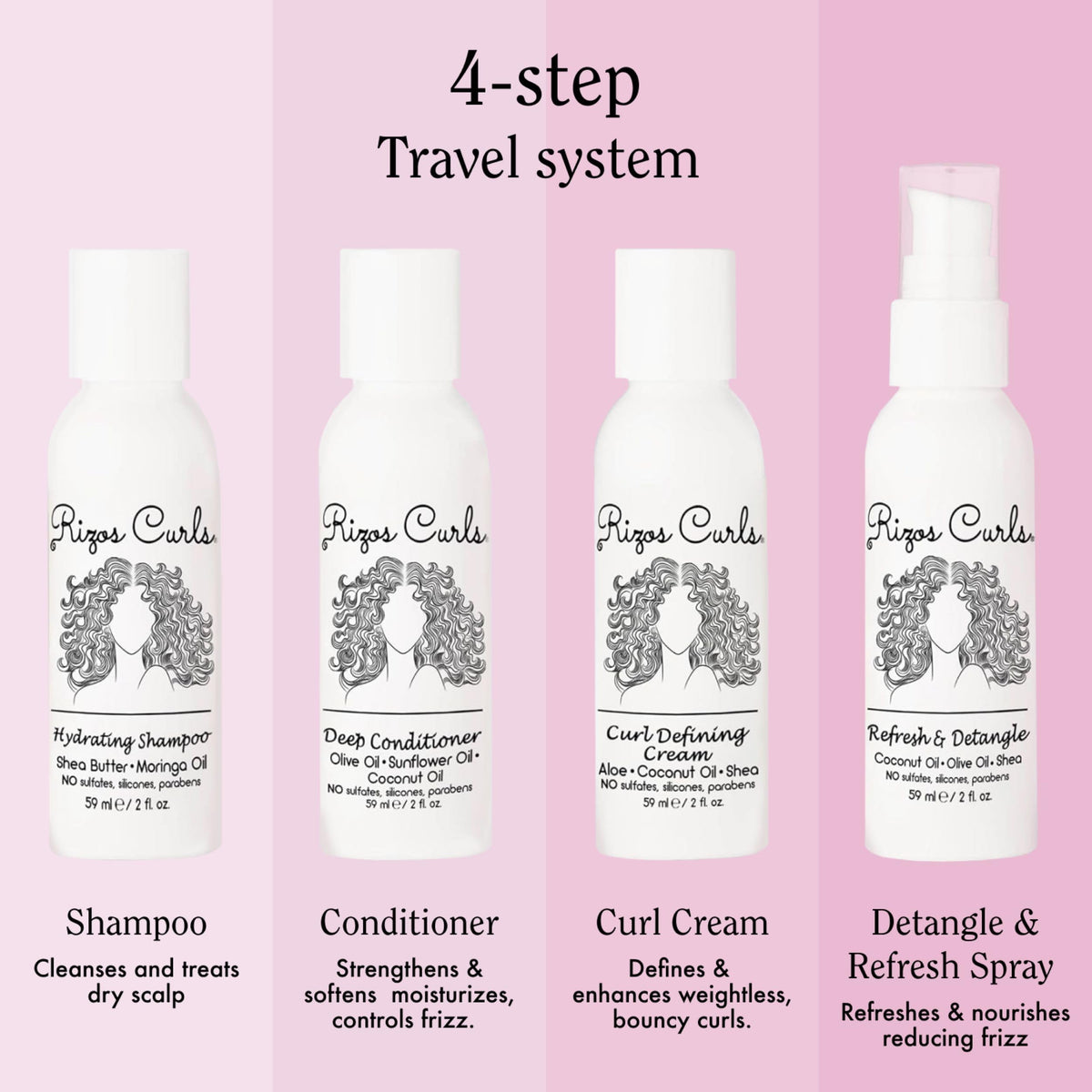 Rizos Curls 4-Step Travel Kit for Curly Hair: Curl Defining Cream, Shampoo, Conditioner, Refresh & Detangle (2 fl oz each)