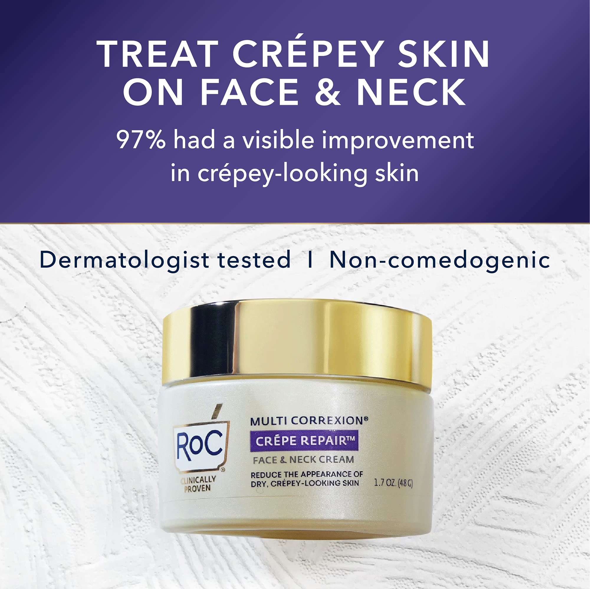 Combat aging signs with RoC Crepe Repair Anti-Aging Daily Face Moisturizer & Neck Firming Cream. This 1.7 oz cream, paired with RoC Retinol Wrinkle Smoothing Capsules, offers a comprehensive skin care routine for both women and men.