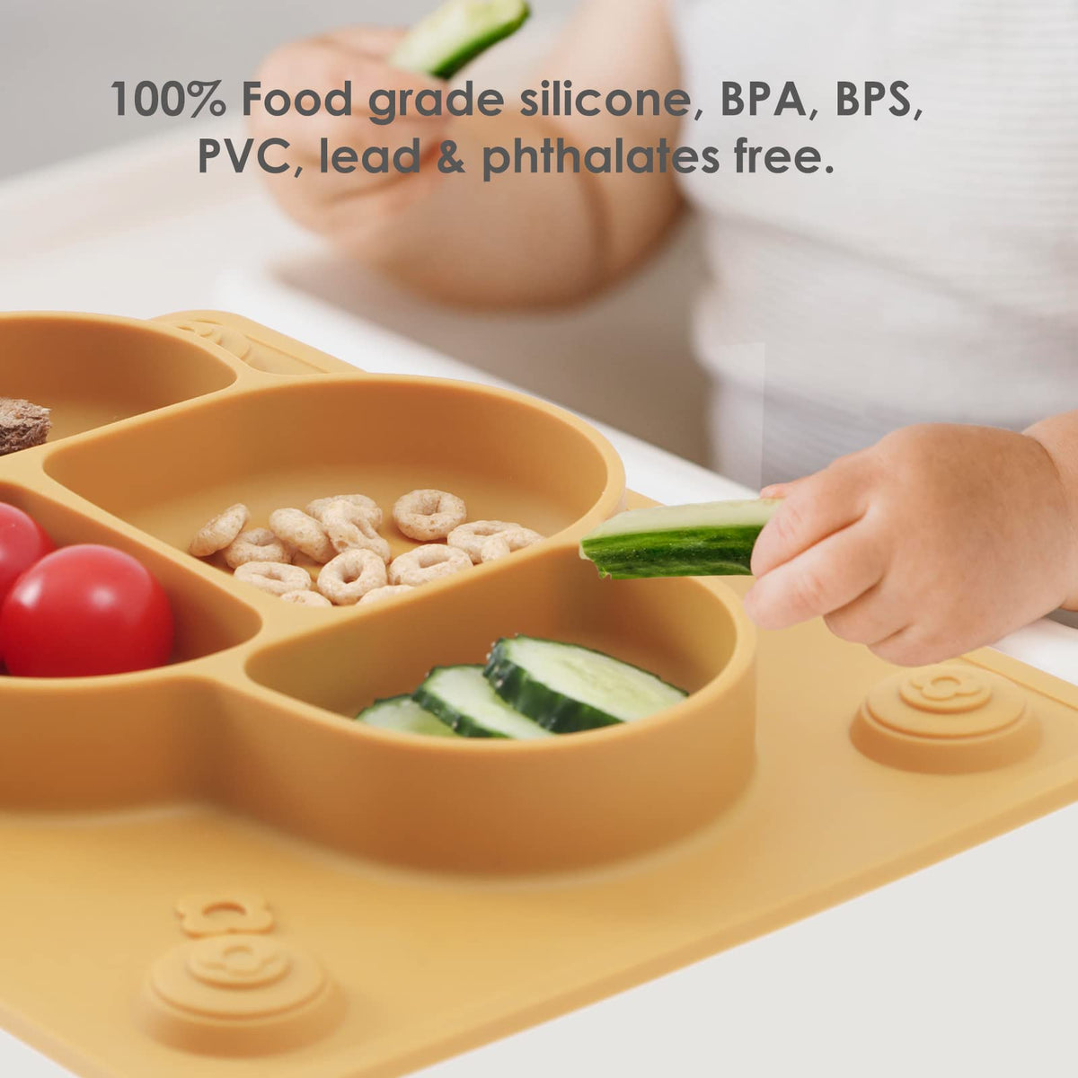 ROCCED Suction Plates for Baby Placemat Spoon Fork Set for Toddlers, Silicone Baby Plates with Suction Baby Dishes for Kids Plates-mustard