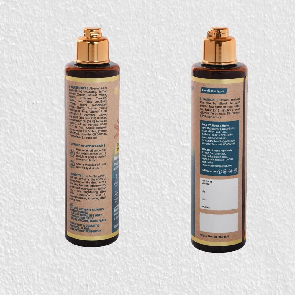 Short Product Description :: This body wash is fully vegan and paraben-free, which means no chemicals are used in it. Indulge in a luxurious shower every morning with the roots and herbs shvet Chandan Saffron body wash (200ml). This moisturizing body wash leaves the skin lightly scented and refreshes the senses. It cleanses the skin gently, leaving it soft and hydrated.