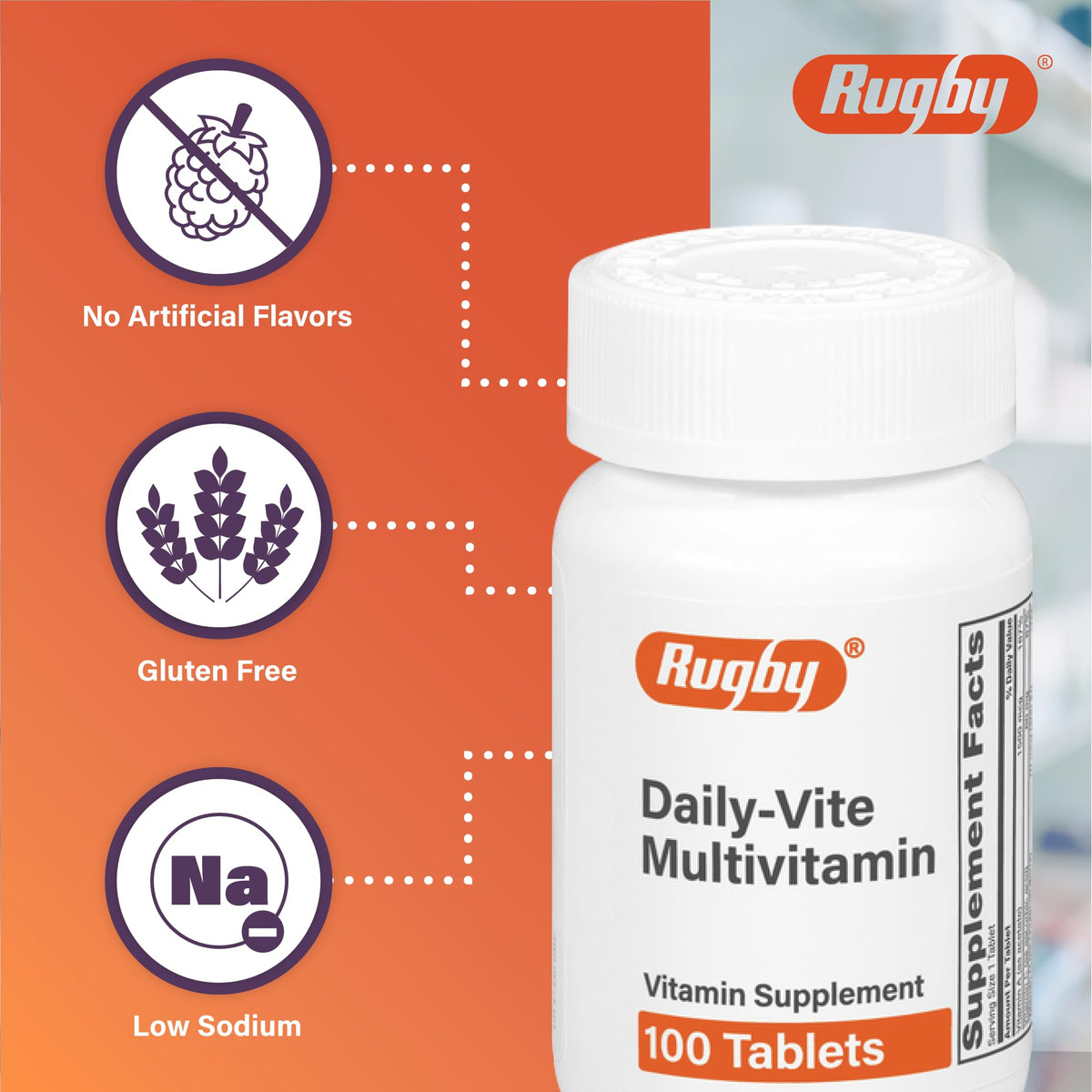 Stay healthy with Rugby Daily-Vite Multivitamin. This daily supplement provides essential vitamins to support your overall well-being. With 100 tablets in each pack, it's a convenient way to ensure you get your daily nutrient requirements.