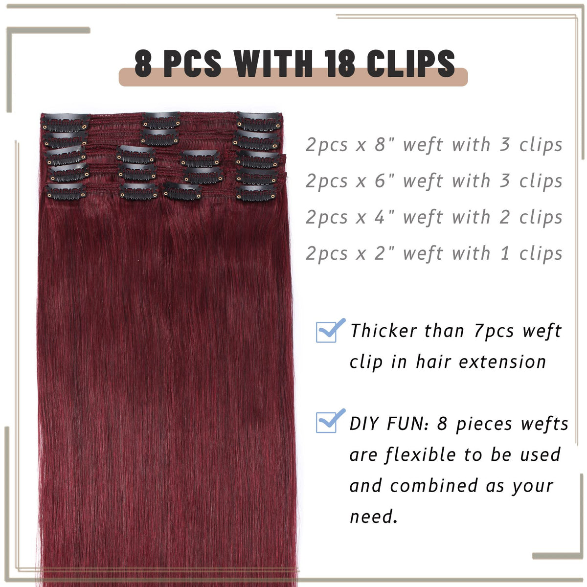 S-noilite Burgundy 100% Remy Human Hair Clip in Extensions Double Weft 16Inch Wine Red Straight Soft Grade 7A Quality 8pcs 18 Clips 130g Thick Full Head Brazilian Hair For Women #99J