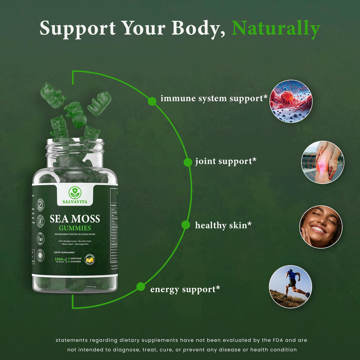 Experience the benefits of SALVAVITA Sea Moss Gummies, a potent blend infused with Bladderwrack, Burdock Root, Black Seed, and Ashwagandha. Enjoy the refreshing lemon flavor in each gummy.