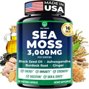 Experience the power of Sea Moss Black Seed Oil Ashwagandha Ginger capsules. This advanced supplement combines Irish Sea Moss, Black Seed Oil, and other potent ingredients for energy, immune support, and gut health.