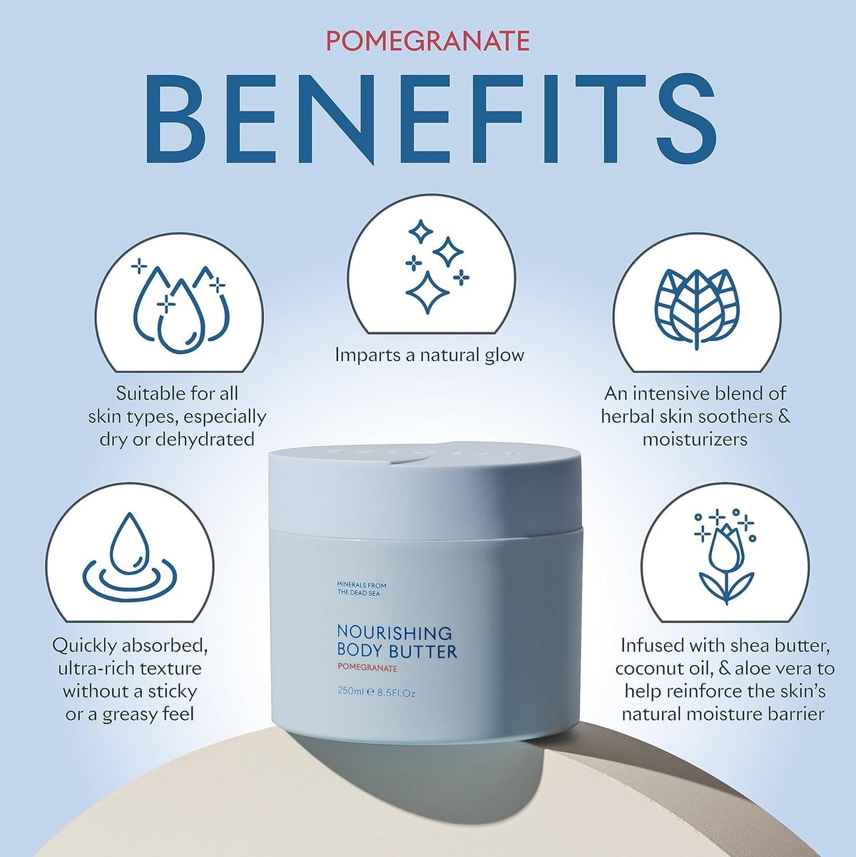 Nourish your skin with SEACRET POMEGRANATE BODY BUTTER. This Hydrating Body Moisturizer Cream enriched with Shea and Cocoa Butter, Vitamins E & C, and Dead Sea Minerals offers deep hydration for all skin types.