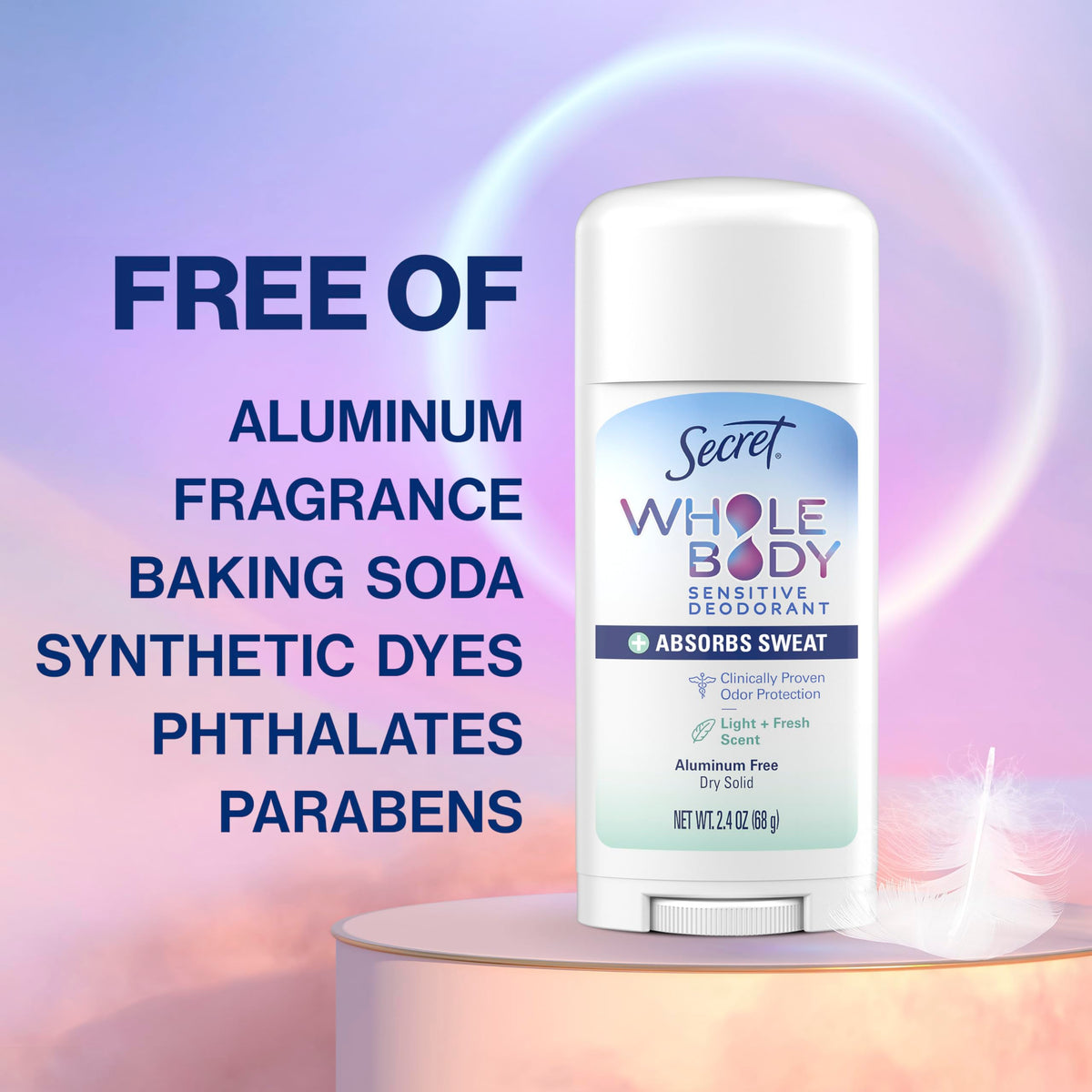 Secret Whole Body Deodorant Dry Feel Stick + Absorbs Sweat for Women, Naturally Derived Ingredients, Light & Fresh Scent, Aluminum Free Deodorant Stick, 72 HR Odor Protection, 2.4 oz