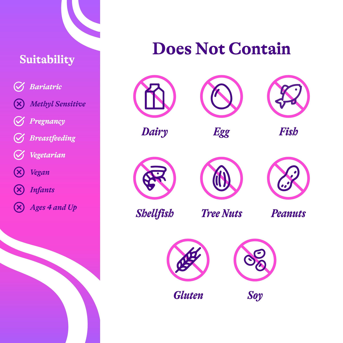 - Free from: Eggs, fish, gluten, GMO, milk, peanuts, shellfish, soy, sesame, tree nuts, wheat, artificial colors, artificial flavors, and artificial preservatives
