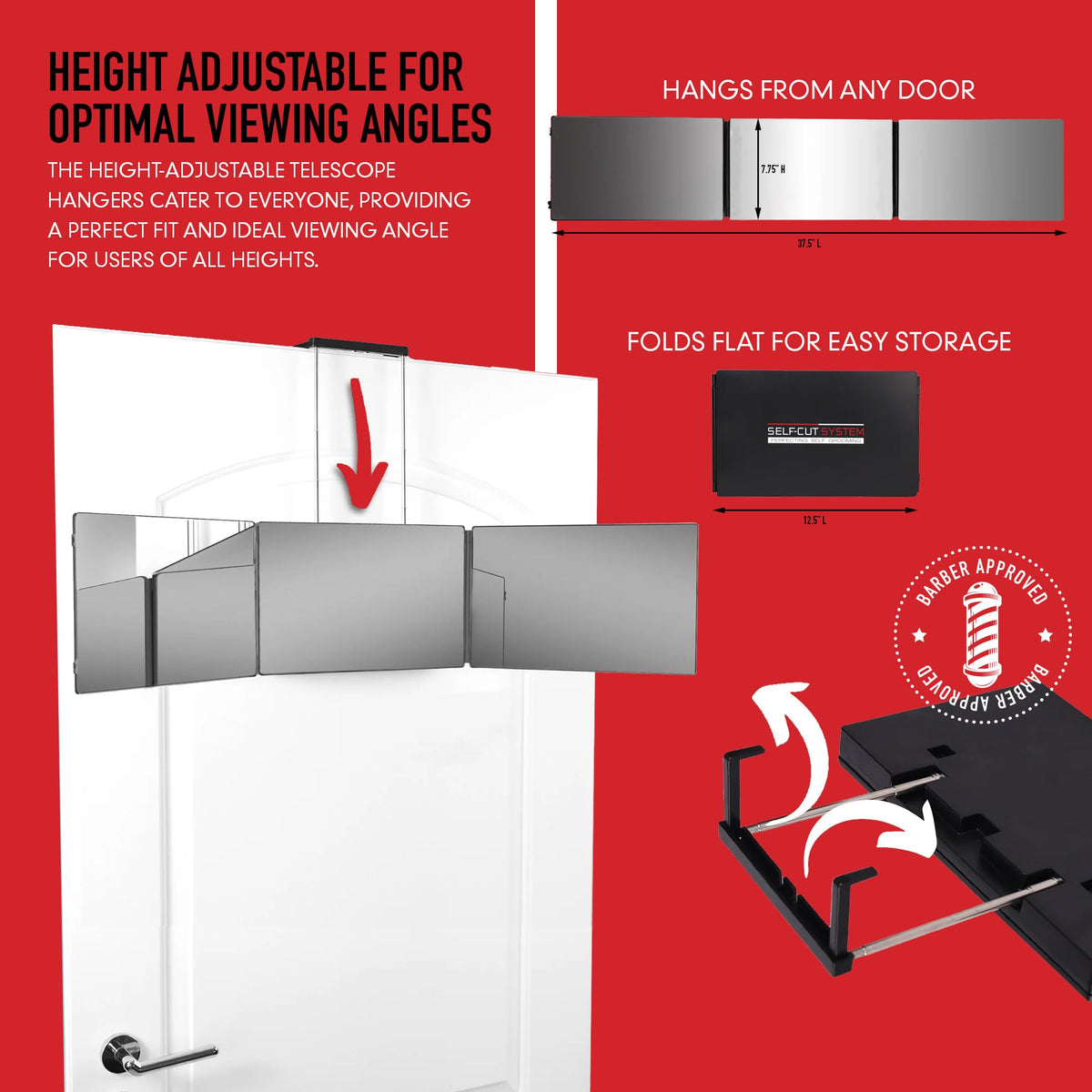 Experience hassle-free self hair cutting with the SELF-CUT SYSTEM Travel Version. This three-way mirror with height adjustable telescoping hooks and a free educational app makes self-grooming easy.
