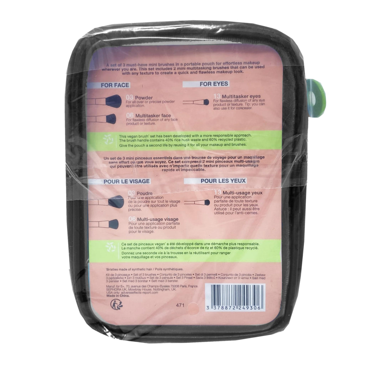 Sephora Collection The Mini Brush Set includes 3 mini makeup brushes and a stylish makeup bag, perfect for on-the-go touch-ups and creating flawless looks wherever you are.