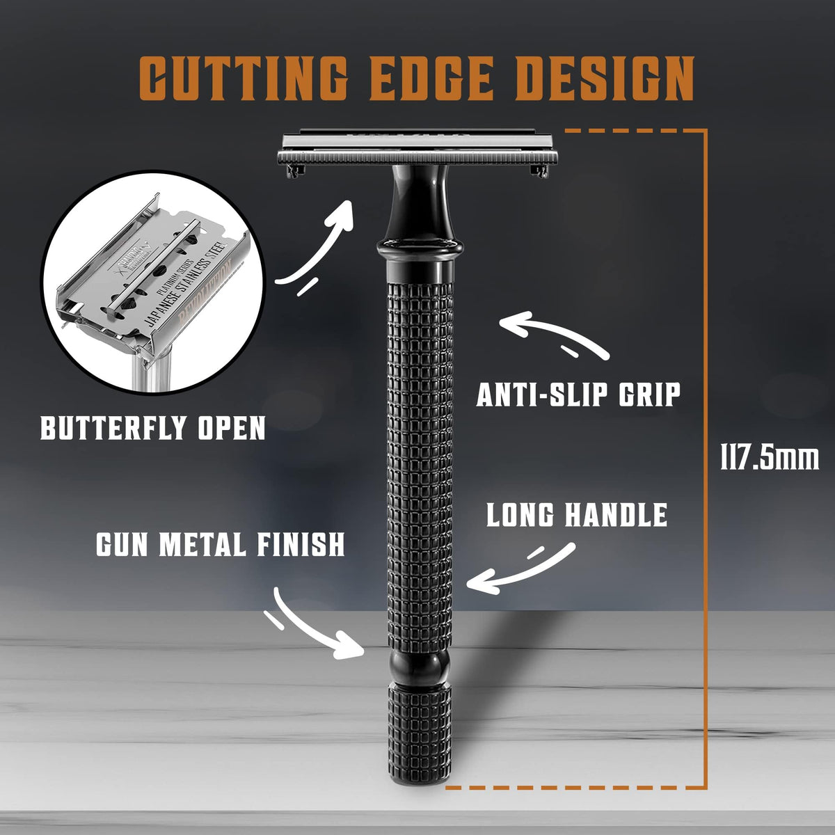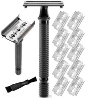 SHAVING REVOLUTION Long Handle Double Edge Safety Razor - Butterfly Open Razor 10 Japanese Stainless Steel Double Edge Blades - Close, Clean Shaving Razor Men., Black Long Handle, 12 Piece Set