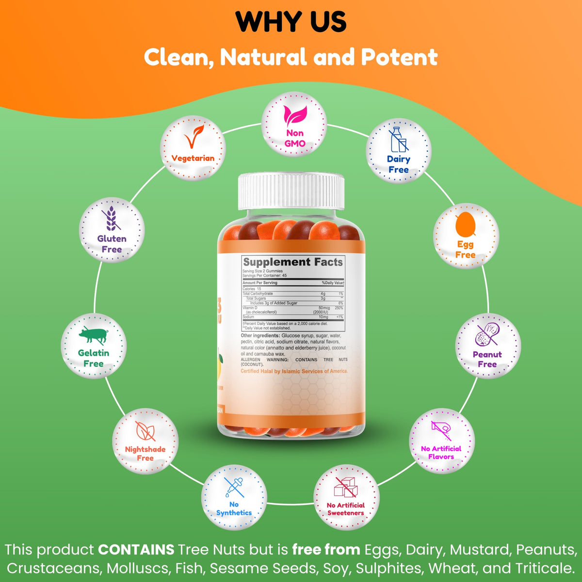 SHIFAA NUTRITION Vegetarian Vitamin D3 Gummies for Adults & Kids | 45-90 Servings, 2,000IU / 1,000IU | Non-GMO, Gluten-Free, Gelatin-Free | Supports Bones, Muscles & Immune System Halal Vitamins