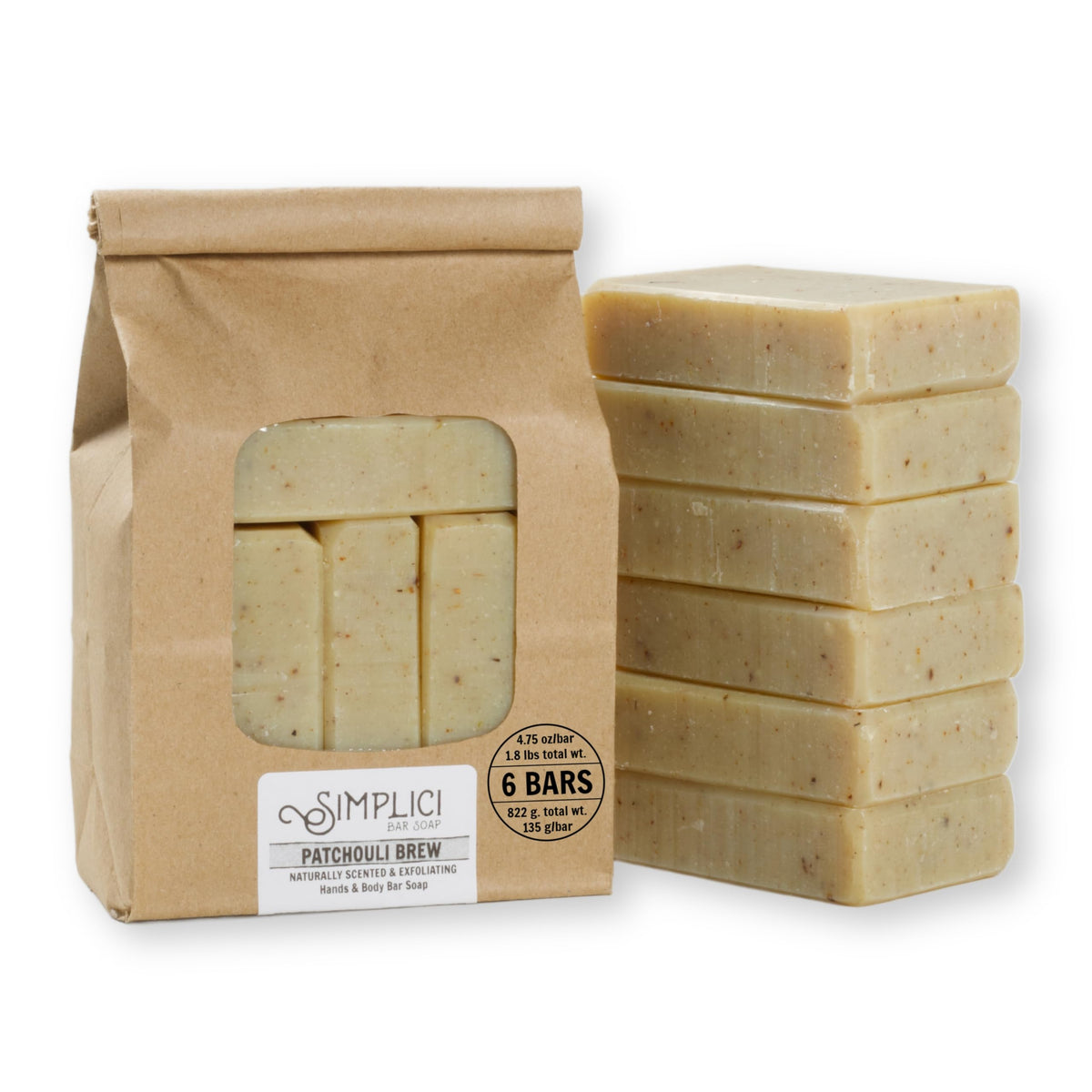 Simplici Patchouli Brew Natural Soap (exfoliating + pure essential oils) 6 Bar Value Bag. Palm Free.