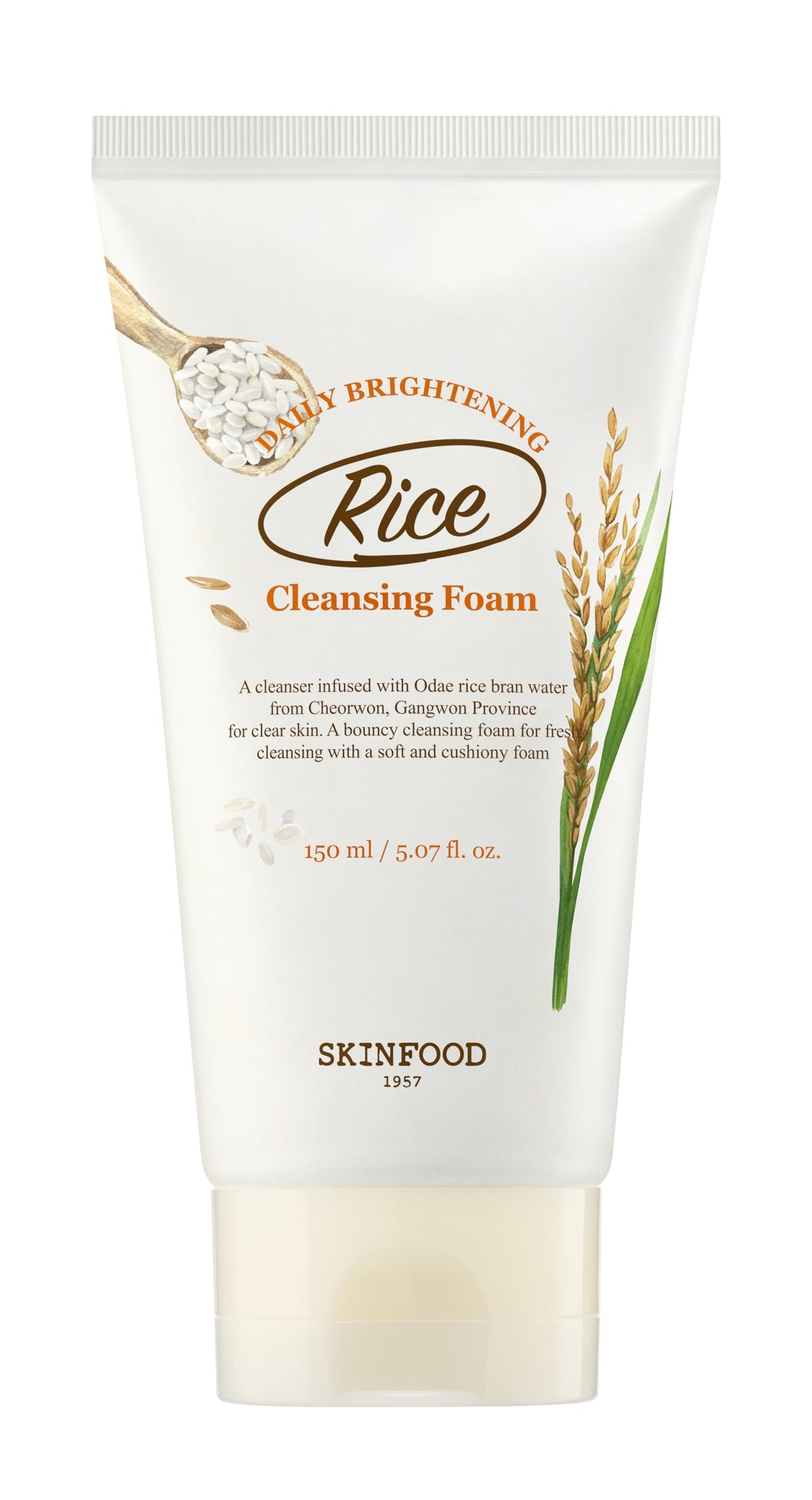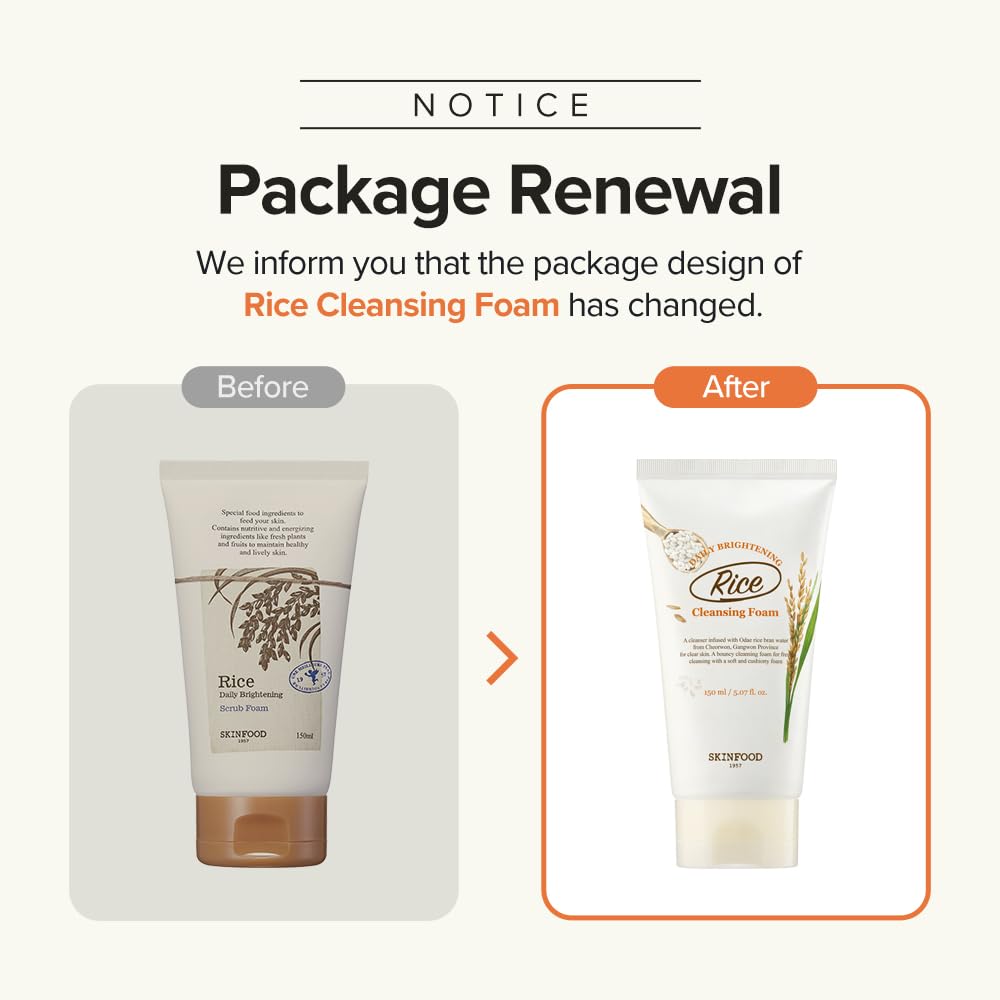 SKINFOOD Rice Daily Cleansing Foam 150ml - Delicate, Fine, and Smooth Brightening Cleansing with Fermented White Rice Ingredients - Firming Bubble Facial Foam Cleanser - For Men and Women (5.07 fl. oz