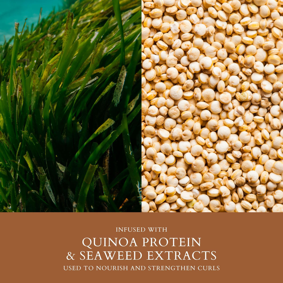 Ingredients: Water, Cetearyl Alcohol, Peg40 Castor Oil, Stearylalkonium Chloride, Cetyl Alcohol, Cetrimonium Chloride, Hydrolyzed Quinoa Protein, Dimethicone, Cyclopentasiloxane, Fucus Vesiculosus Seaweed Extract, Spirulina Platensis Protein, Ascophyllum Nodusum Kelp Extract, Chondrus Crispus Carrageenan Extract, Foeniculum Vulgare Fennel Seed Extract, Helianthus Annuus Sunflower Seed Extract, Aloe Barbadensis Leaf Juice, Matricaria Recutita Chamomile Extract, Rosmarinus Officinalis Rosemary Extract, Urtica Dioica Nettle Extract, Simmondsia Chinensis Jojoba Seed Oil, Persea Americana Avocado Seed Oil, Aleuritis Moluccana Kukui Seed Oil, Fragrance, Phenoxyethanol, Gluconolactone Sodium Benzoate, Panthenol Vitamin B5, Cetyl Bromide, Panthenol Vitamin B5, Citric Acid.