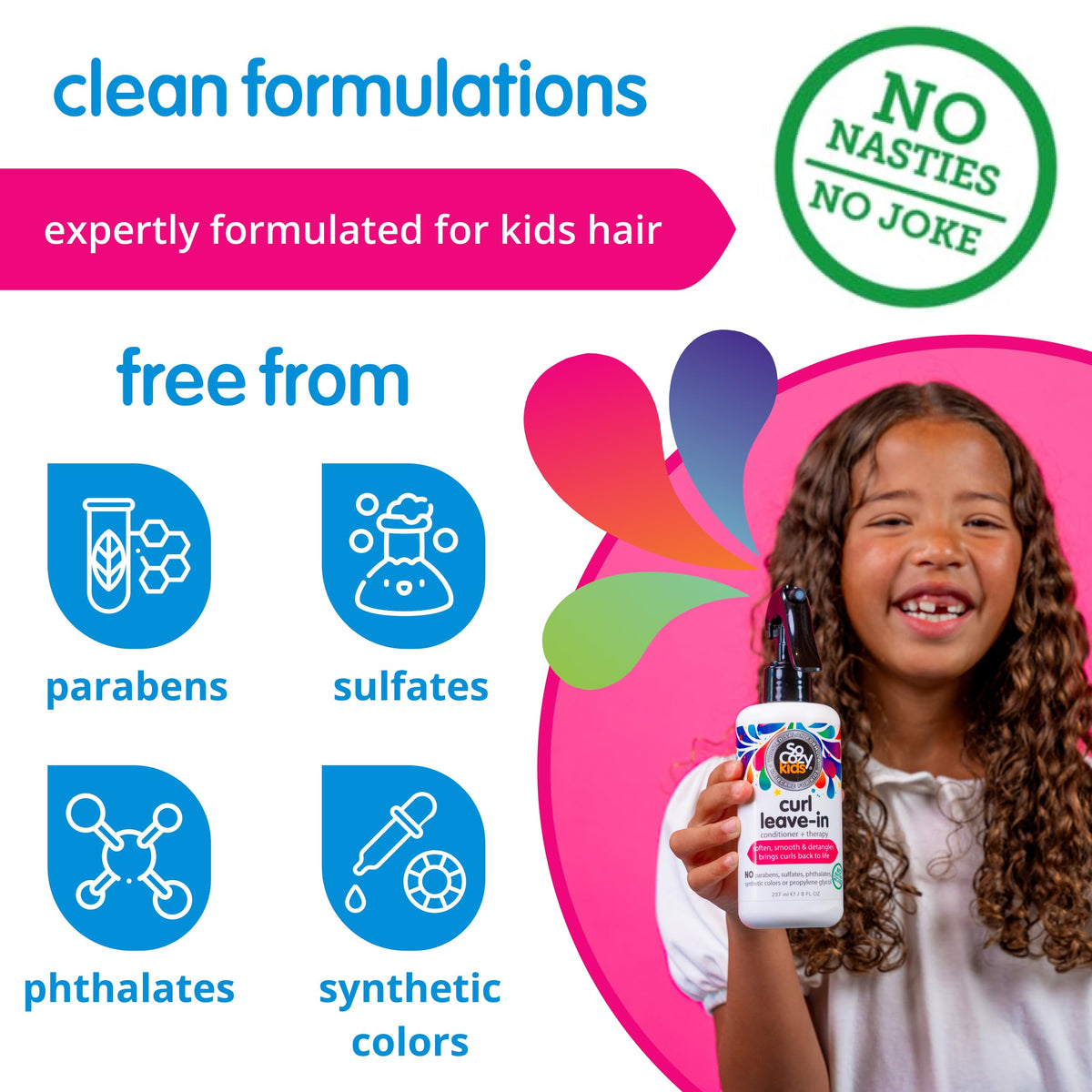 Nourish and detangle your child's curly hair with SoCozy Leave In Conditioner Spray. This gentle formula enriched with Keratin, Vitamin B5, Olive, and Jojoba Oil helps in maintaining tangle-free curls that are soft, manageable, and healthy.