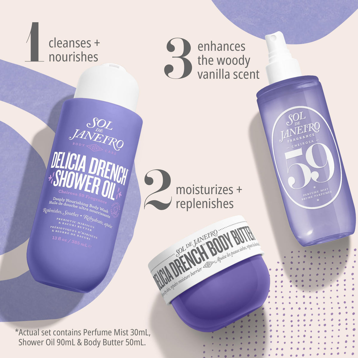 Short Product Description :: Your travel-ready routine for deeply moisturized skin. Nourish and cleanse skin with Delícia Drench Shower Oil. Lock in moisture and soothe skin with Delícia Drench Body Butter. Finish with the uplifting Cheirosa 59 Perfume Mist.