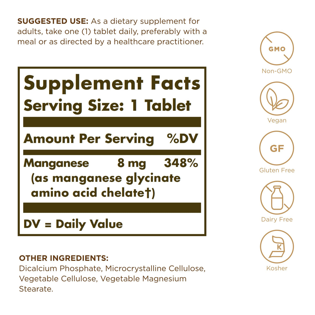 Support your bone, joint, and nerve health with Solgar Chelated Manganese tablets. Each pack contains 100 tablets, giving you 300 total servings of quality nutrition. Made with non-GMO, vegan, gluten-free, dairy-free, and kosher ingredients, these tablets are designed to enhance your overall well-being. Experience the benefits of manganese in chelated form for optimized absorption and effectiveness. Take a step towards a healthier you with Solgar Chelated Manganese.
