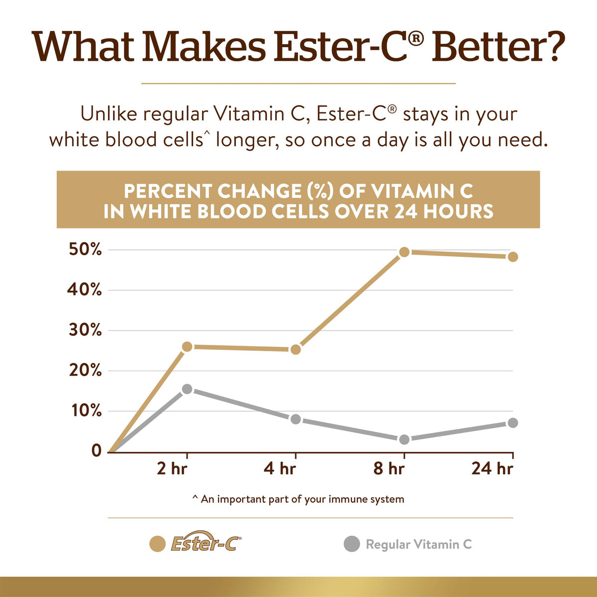 Active Ingredients: Vitamin C (as Ester-C® Calcium Ascorbate), Calcium (as Ester-C®Calcium Ascorbate), Citrus Bioflavonoids Complex: Citrus Bioflavonoids (Citrus spp.) (fruit), Sweet Orange, Tangerine, Lime, Lemon, Acerola, Rutin, Hesperidin Complex (Citrus spp.) (fruit), Naturally Occurring Vitamin C Metabolites.