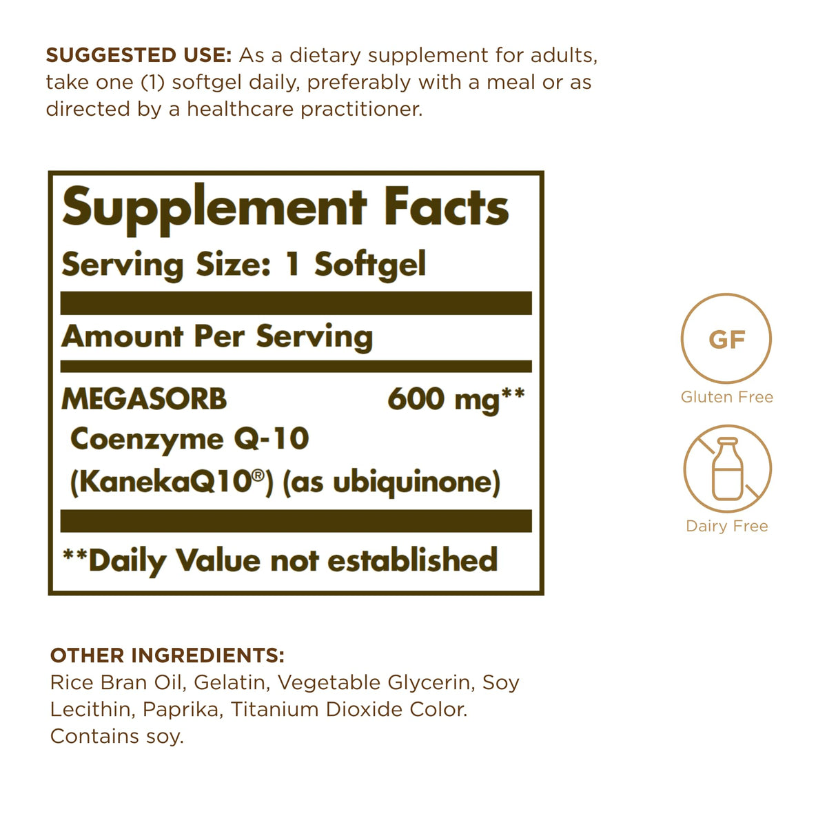 Support your heart health with Solgar Megasorb CoQ-10 600 mg softgels. Each pack of 3 offers 90 total servings for enhanced absorption. Made by Solgar, known for their natural health products. Gluten and dairy-free for your peace of mind. Elevate your wellness routine with this supplement.