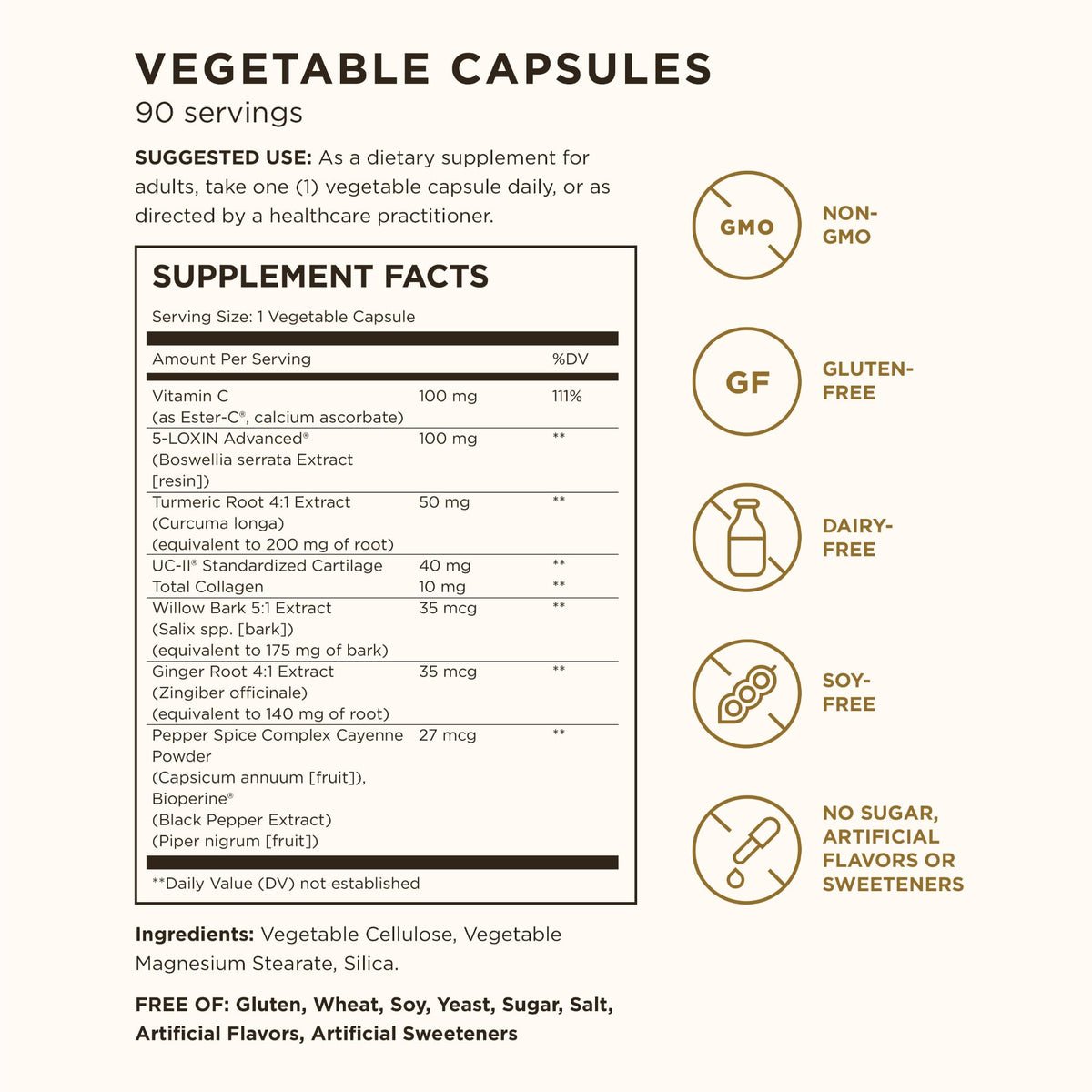 Active Ingredients: Undenatured Standardized Cartilage, 5-Loxin Advanced, Ester-C, Turmeric, Ginger, White Willow Bark, BioPerine