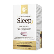 The packaging contains Solgar Triple Action Sleep tablets designed to help you relax, fall asleep faster, and stay asleep longer.