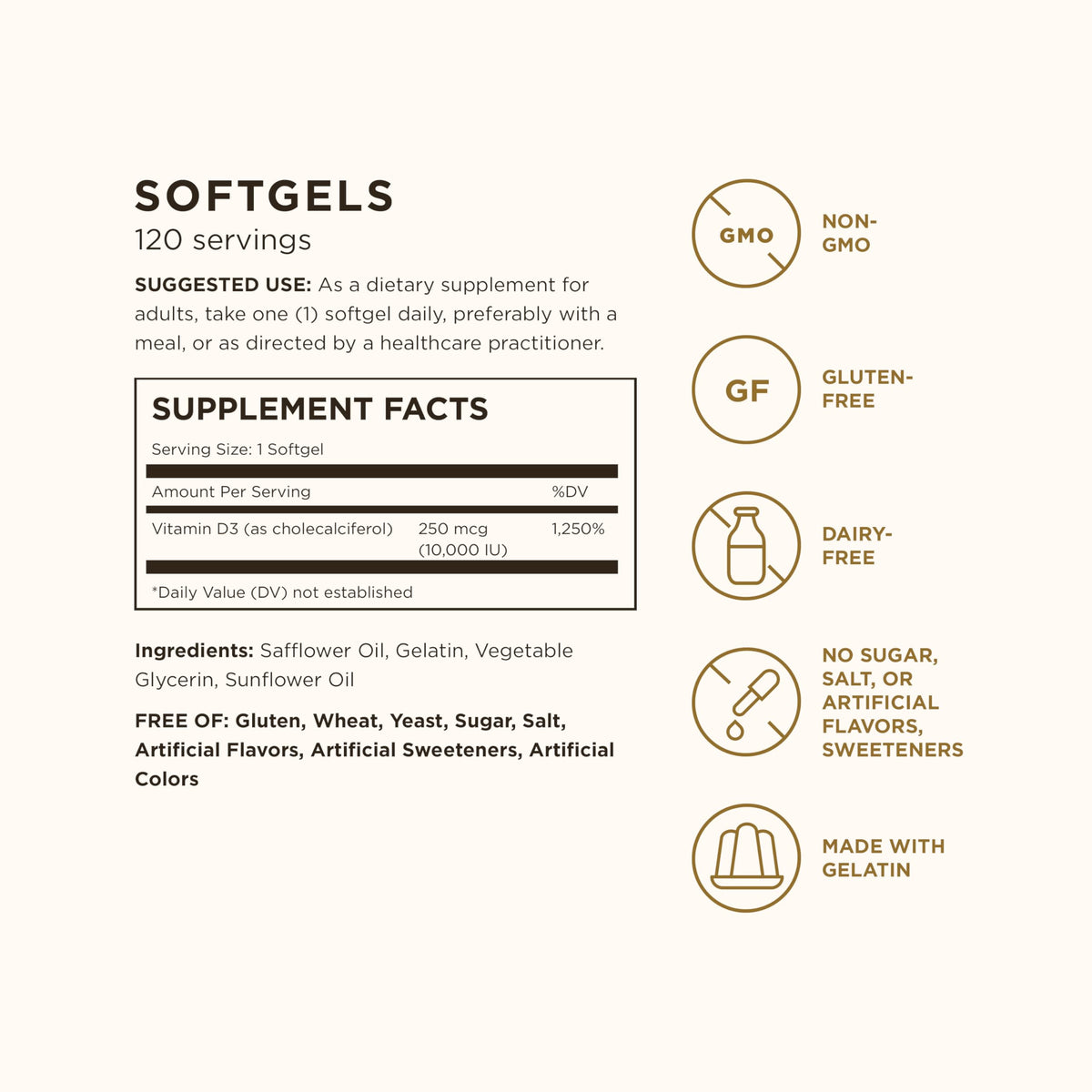Ingredients: Vitamin D3 250 mcg (as cholecalciferol), Safflower Oil, Gelatin, Vegetable Glycerin, Sunflower Oil. FREE OF: Gluten, Wheat, Dairy, Soy, Yeast, Sugar, Sodium, Artificial Flavor, Sweetener, Preservatives, and Color