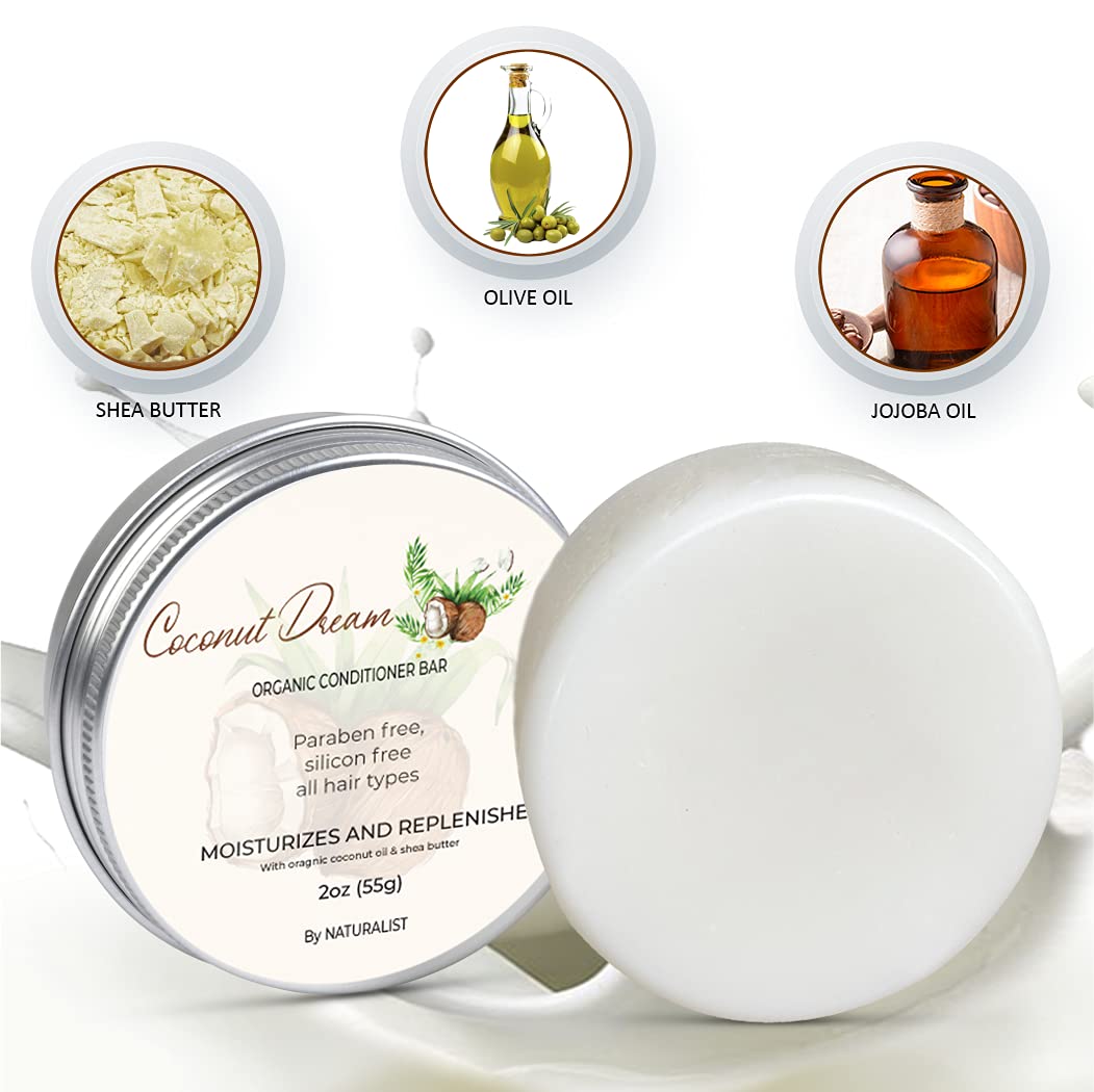 Solid Conditioner Bar, Organic, Plant Based, SLS Free, Vegan, All Hair Types | pH Balanced, Plastic Free | Eco Friendly, Safe For Travel (Coconut Dream) | 2oz