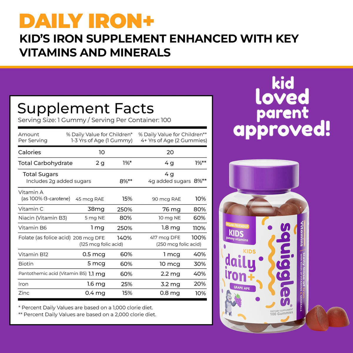 Squiggles Kids Daily Iron+ Gummies - Gummy Vitamin, Low Sugar, Boost of Vitamins, Minerals and Iron, Vegan Supplement, Chewy, Yummy Grape Flavor, 100 Count