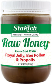 Stakich Royal Jelly, Bee Pollen, Propolis Raw Honey is a pure and unprocessed blend of royal jelly, bee pollen, propolis, and raw honey. This 40-ounce jar offers natural goodness and nutritional benefits.