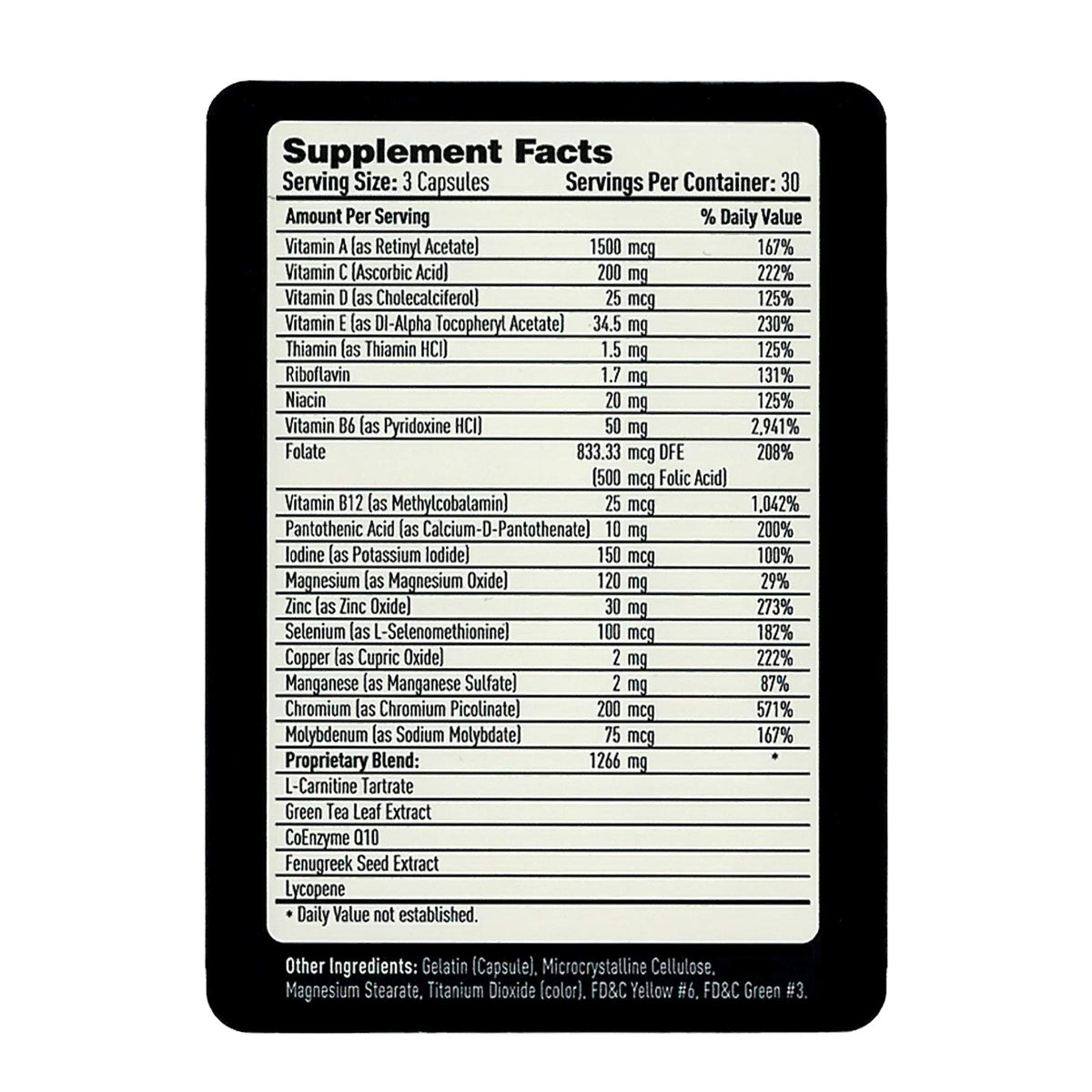 Ingredients :: Vitamin A, Vitamin C, Vitamin D, Vitamin E, Thiamin, Riboflavin, Niacin, Vitamin B6, Folate, Vitamin B12, Pantothenic Acid, Iodine, Magnesium, Zinc, Selenium, Copper, Manganese, Chromium,Molybdenum, L-Carnitine, Green Tea Extract, CoQ10, Fenugeek Seed Extract, Lycopene