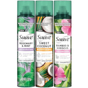 Suave Dry Shampoo Spray Variety 3-Pack offers invigorating rosemary & mint, volumizing bamboo & hibiscus, and refreshing sweet coconut sprays. Each 4.3 Oz spray provides quick and convenient hair refreshment.