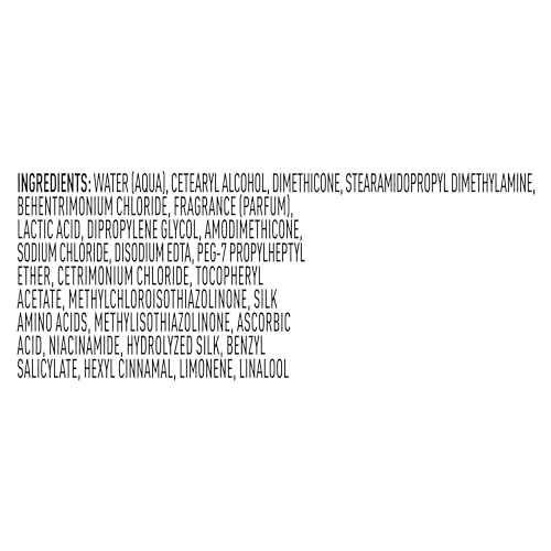 Ingredients: WATER AQUA, CETEARYL ALCOHOL, DIMETHICONE, STEARAMIDOPROPYL DIMETHYLAMINE, BEHENTRIMONIUM CHLORIDE, FRAGRANCE PARFUM, LACTIC ACID, DIPROPYLENE GLYCOL, AMODIMETHICONE, SODIUM CHLORIDE, DISODIUM EDTA, PEG7 PROPYLHEPTYL ETHER, CETRIMONIUM CHLORIDE, TOCOPHERYL ACETATE, METHYLCHLOROISOTHIAZOLINONE, SILK AMINO ACIDS, METHYLISOTHIAZOLINONE, ASCORBIC ACID, NIACINAMIDE, HYDROLYZED SILK, BENZYL SALICYLATE, HEXYL CINNAMAL, LIMONENE, LINALOOL