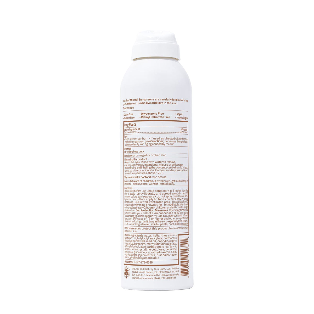 Sunscreen Spray, Spf 30: Sun Bum Mineral Sunscreen Spray, Spf 30, Broad Spectrum Uva/Uvb Protection, Hypoallergenic, Paraben Free, Gluten Free, Vegan, 1 Count