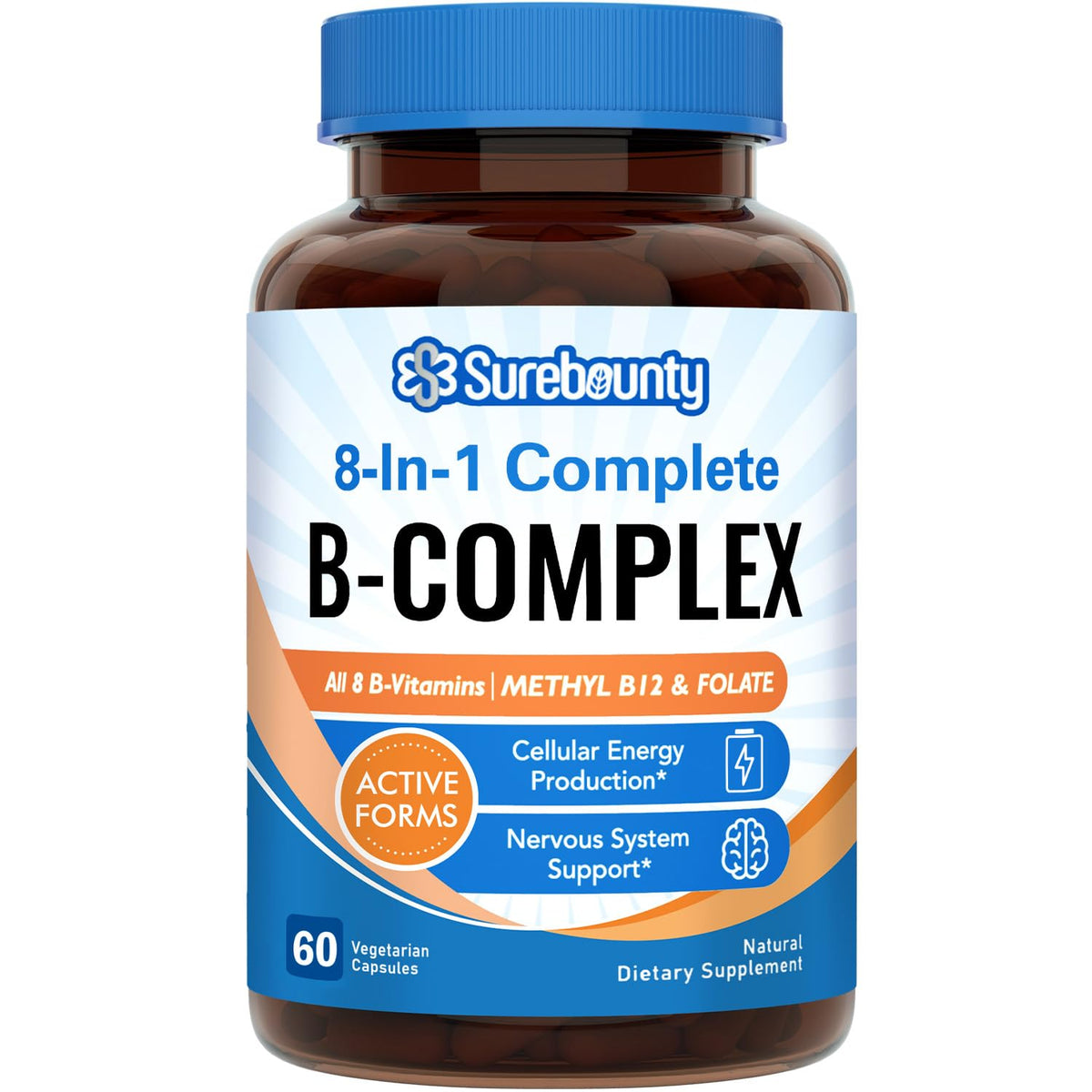 Surebounty 8-in-1 Vitamin B Complex Capsules for Women & Men, Super B Complex Vitamins, B12, B1, B2, B3, B5, B6, B9, Biotin, Folate, Methylated Forms, Energy, Nerve, Blood Support, 60 Caps