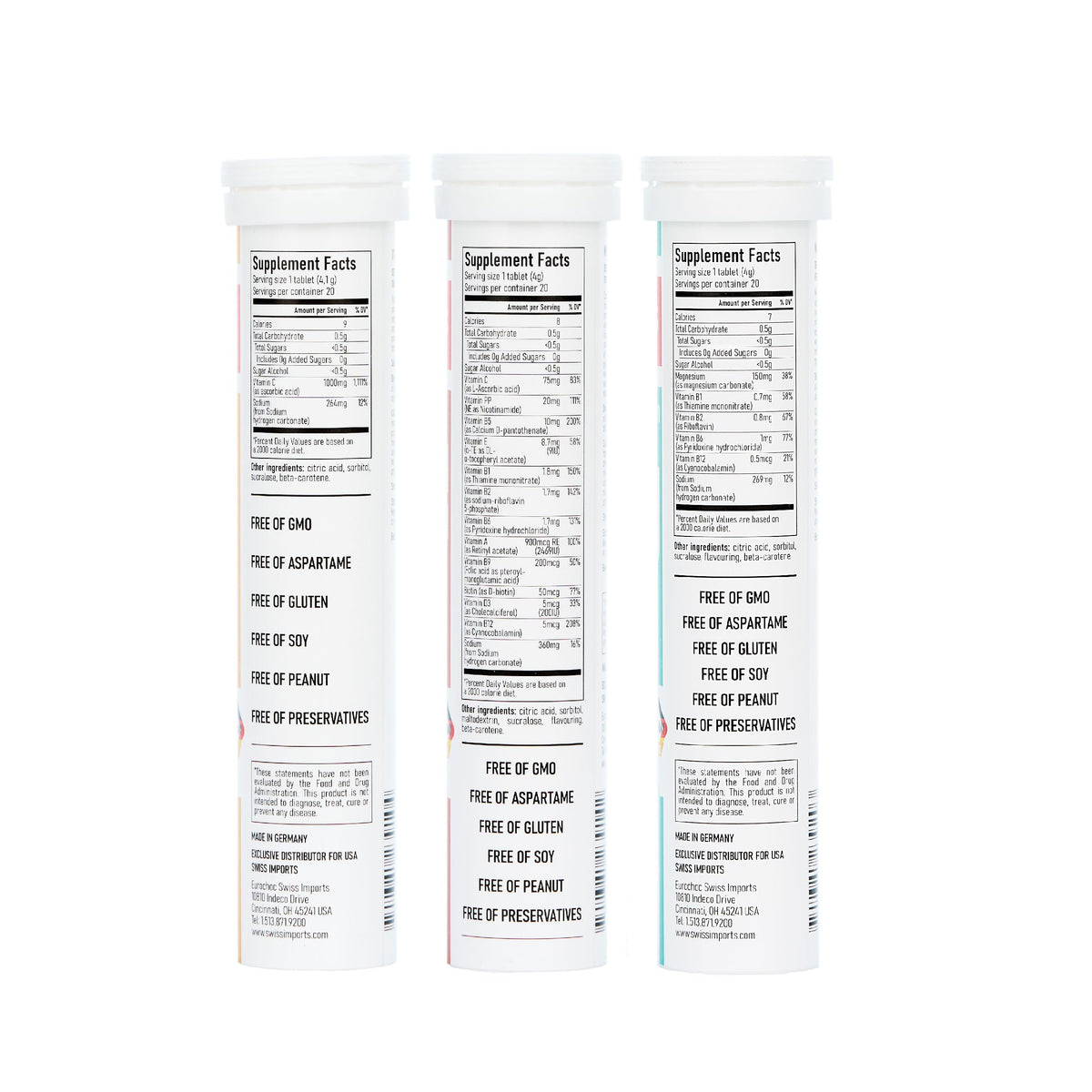 Swiss Imports Effervescent Variety Pack with Vitamin C 1000mg, Magnesium + B Complex, Multivitamin + Biotin, 12-Pack, 240 Tablets