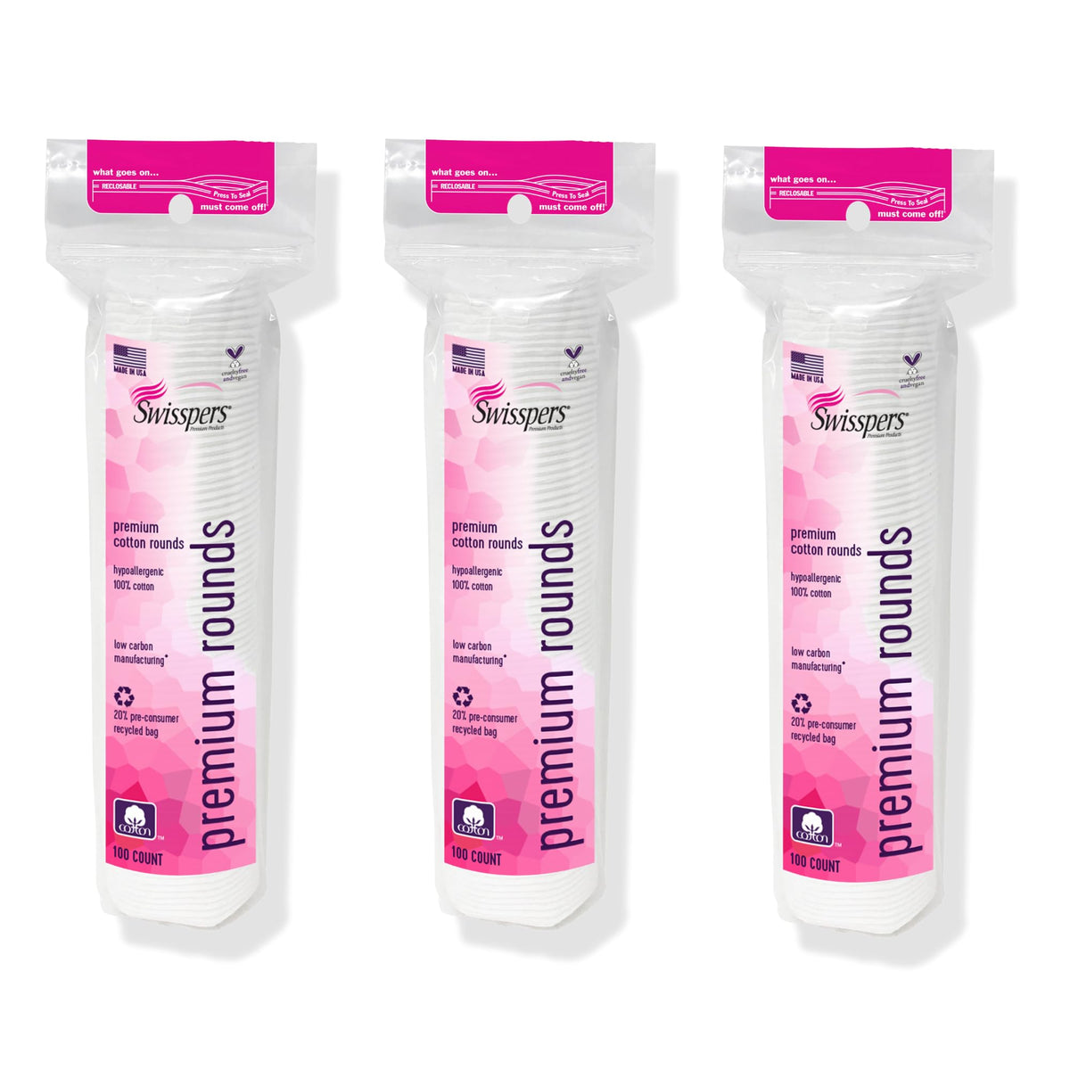 Swisspers Premium Cotton Rounds are essential pads for makeup removal, skincare, baby care, and facial cleansing. Made from 100% pure cotton, these soft and absorbent rounds are hypoallergenic and lint-free, providing a gentle touch for all your skincare needs.