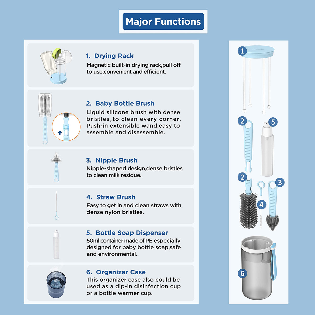 TechoEcho Travel Baby Bottle Brush Set with Extendable Liquid Silicone Bottle Brush,Nipple Brush,Built-in Bottle Drying Rack,Straw Cleaner Brush,Baby Bottle Soap Dispenser,Bottle Warmer (Blue)