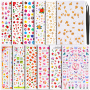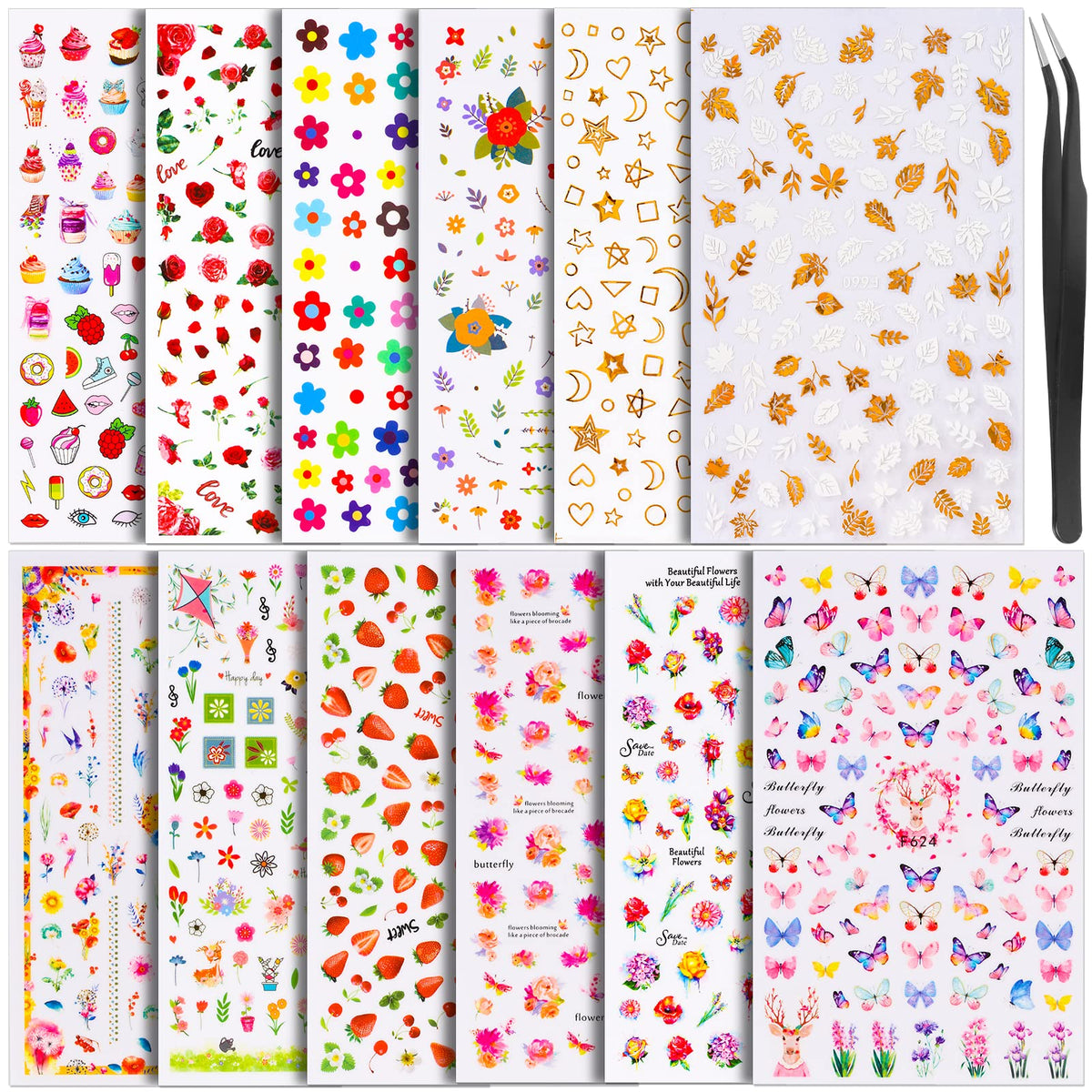 Teenitor Nail Art Stickers Self-Adhesive, 12 Sheets Flower Nail Stickers Butterfly Nail Decals Nail Stickers for Kids Flower Butterfly Stars Fruits Leaves Nail Decoration Stickers for Women Kids
