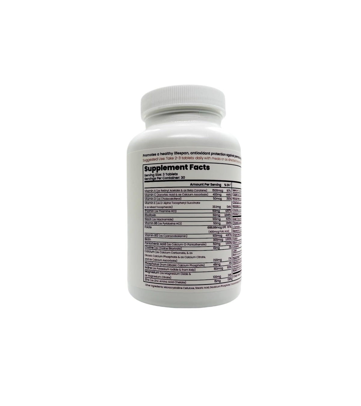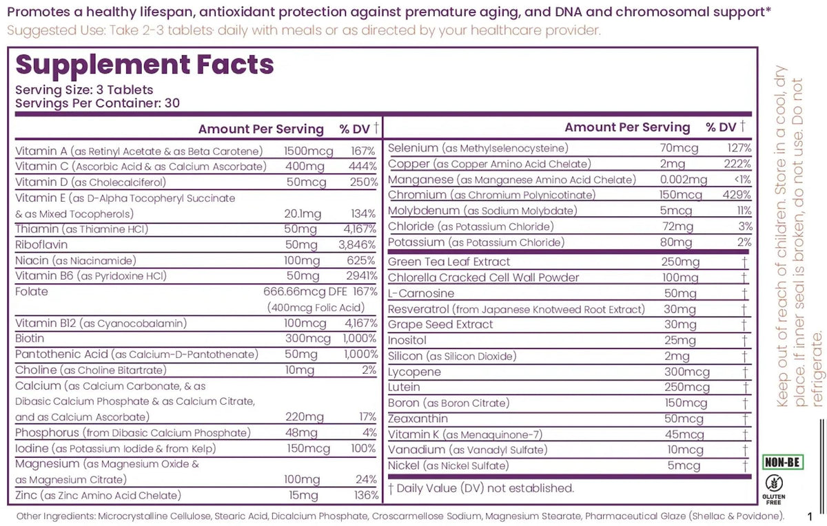 Ingredients :: Vitamin A, Vitamin C, Vitamin D, Vitamin E, Thiamin, Riboflavin, Niacin, Vitamin B6, Folate, Vitamin B12, Biotin, Pantothenic Acid, Choline, Calcium, Phosphorus, Iodine, Magnesium, Zinc, Selenium, Copper, Manganese, Chromium, Molybdenum, Chloride, Potassium, Green Tea Leaf Extract, Chlorella Cracked Cell Wall Powder, L-Carnosine, resveratrol, Grape Seed Extract, Inositol, Silcon, Lycopene, Lutein, Boron, Zeaxanthin, Vitamin K, Vanadium, Nickel