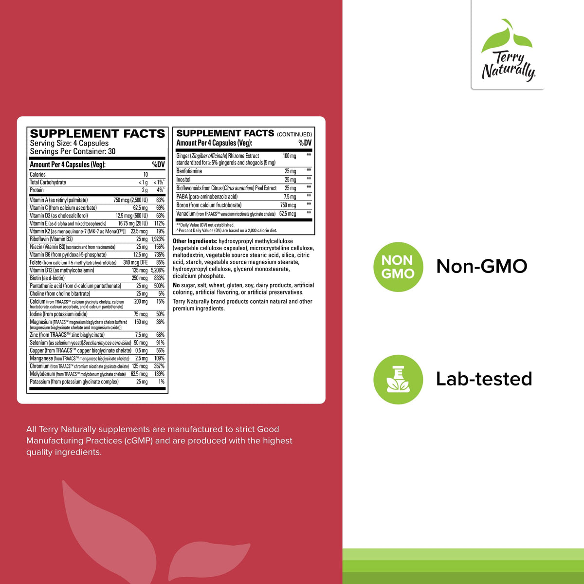 Ingredients :: Serving Size: 4 Capsules Servings Per Container: 30 Amount Per 4 Capsules (Veg): %DV Calories 10 Total Carbohydrate < 1 g <1% Protein 4%* Vitamin A (as retinyl palmitate) 750 mcg (2,500 lU) 83% Vitamin C (from calcium ascorbate) Vitamin D3 (as cholecalciferol) 62.5 mg 69% Vitamin E (as d-alpha and mixed tocopherols) 12.5 mcg (500 lU) 63% 16.75 mg (25 1U) 112%