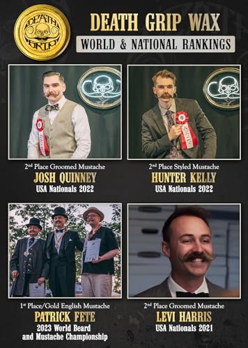 CAUTION FOR SERIOUS MOUSTACHES ONLY If you are a man looking to take his mustache game to the next level Death Grip is the mustache wax for you. The right ladies will take notice people will talk to you regularly about your stylish mustash grooming skills. A hairdryer or a heat source is necessary to warm the waxup to make it malleable, then with a little bit of practice, youll be able to get your stash just right. EXTRA STRONG HOLD Our mustache wax has a pliable semisticky tacky glue like wax feel that holds those unruly stash whiskers in place for 8 hours even in hot weather. Some of our loyal customers report a stronghold overnight or even for several days. Of course, every mustache is unique. For those in warmer climates like Arizona or Florida this is the serious hold moustache wax you have been looking for that does NOT pill up. HANDCRAFTED MADE IN THE USA All natural cruelty free ingredients competition grade moustache wax. DEATH GRIP MUSTACHE WAX GUARANTEE If you are not satisfied for any reason we will refund your money.