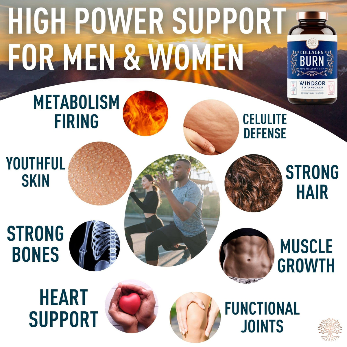 Experience the power of Thermogenic Multi Collagen Burn Capsules. This 2-pack of 180 pills contains hydrating Hyaluronic Acid and marine collagen supplements, enriched with Vitamin C for women and men seeking a comprehensive collagen complex.