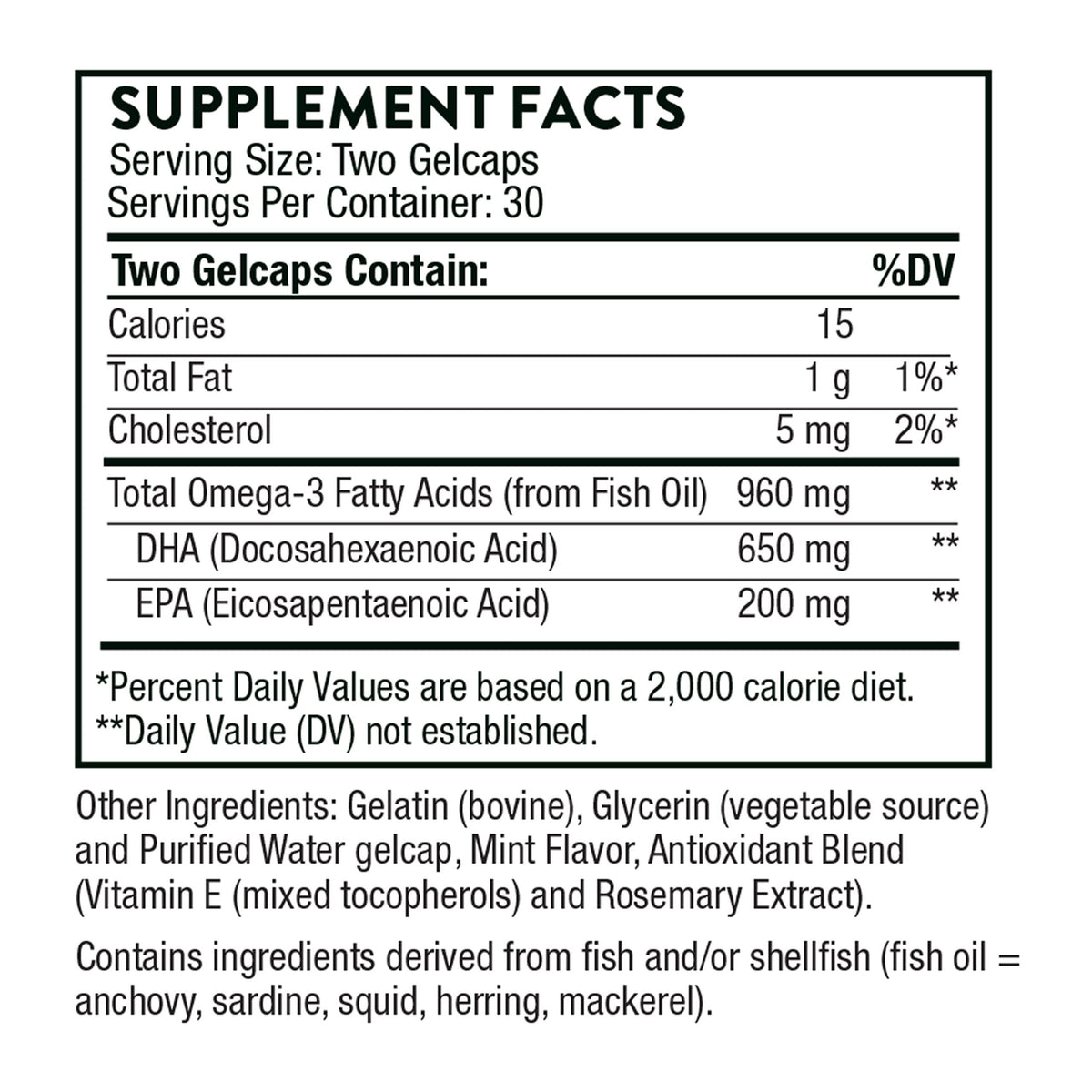 Ingredients :: DHA (Docosahexaenoic Acid) 650mg, EPA (Eicosapentaenoic Acid) 200mg, Omega-3 Fatty Acids (EPA/DHA) 960mg. Other Ingredients: Antioxidant Blend (Vitamin E (mixed tocopherols) and Rosemary Extract), Gelatin (Bovine), Glycerin (Vegetable Source), Mint Flavor, Purified Water Gelcap