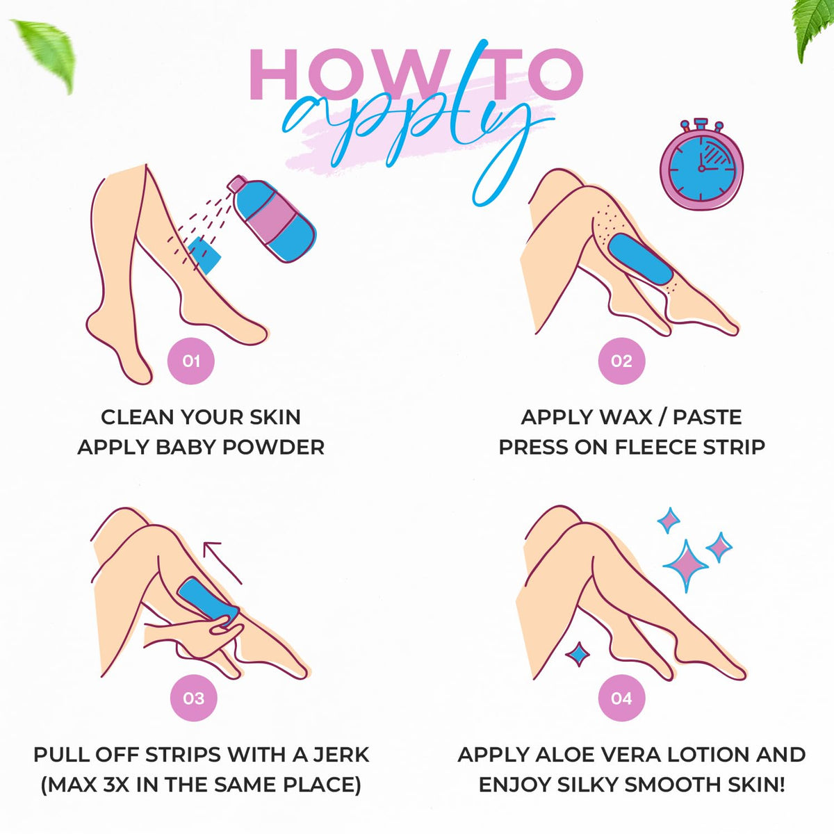 To use the Tifara Beauty Non Woven Body and Facial Wax Strips Multi Size Pack 1. Clean and dry the area of the skin where you intend to apply the wax strips. 2. Apply a thin layer of your chosen wax to the skin. 3. Place a wax strip over the waxed area, ensuring good contact between the strip and the wax. 4. Firmly rub the strip in the direction of hair growth to help the wax adhere to the hairs. 5. Holding the skin taut, quickly pull the strip away in the opposite direction of hair growth. 6. Repeat the process as needed, ensuring that the wax remains at a comfortable temperature. 7. After use, dispose of the wax strips properly and clean the area as needed.