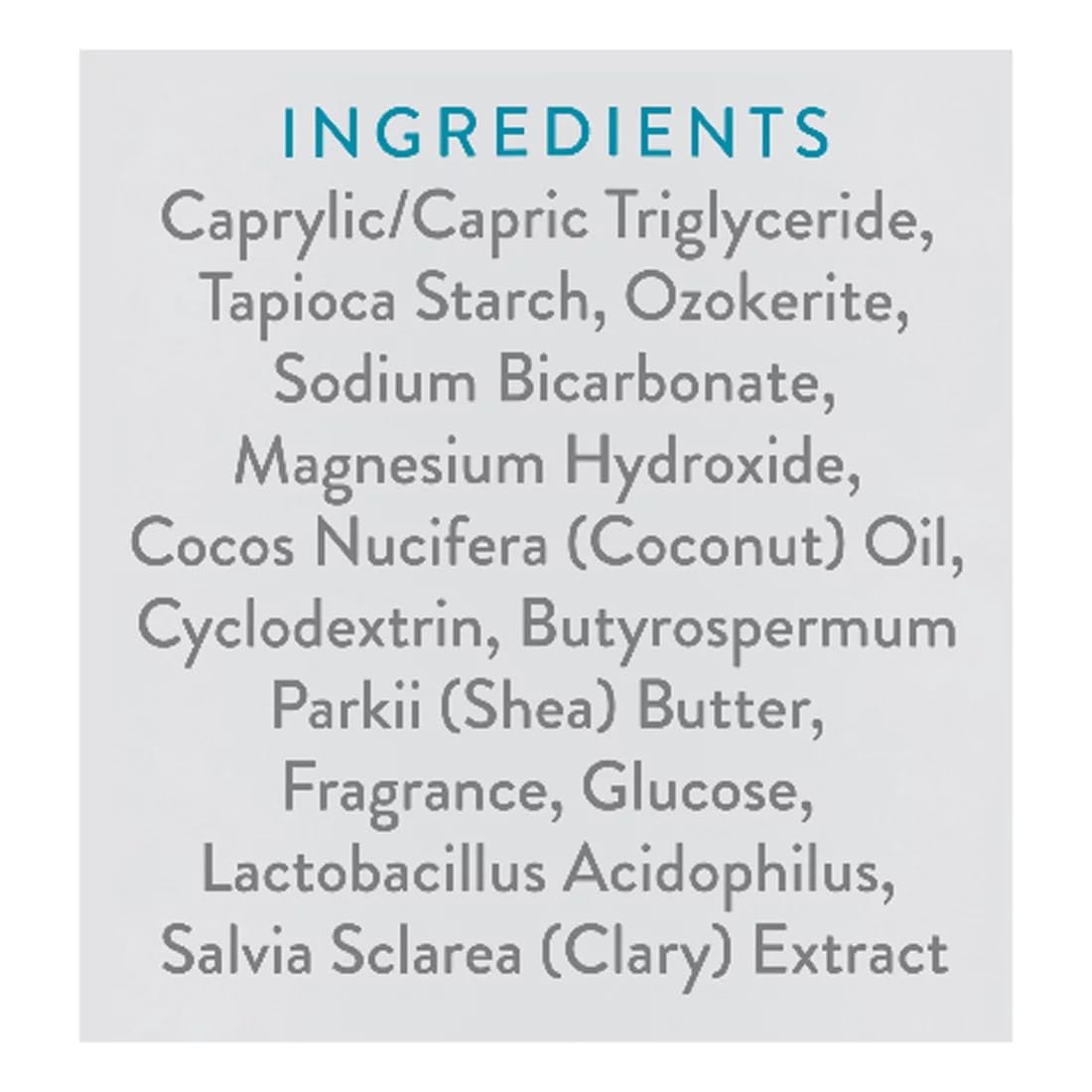 Full Ingredients: Coconut Oil, Shea Butter, Baking Soda, Tapioca Starch, Ozokerite, Caprylic/Capric Triglyceride, Magnesium Hydroxide, Cyclodextrin, Fragrance.