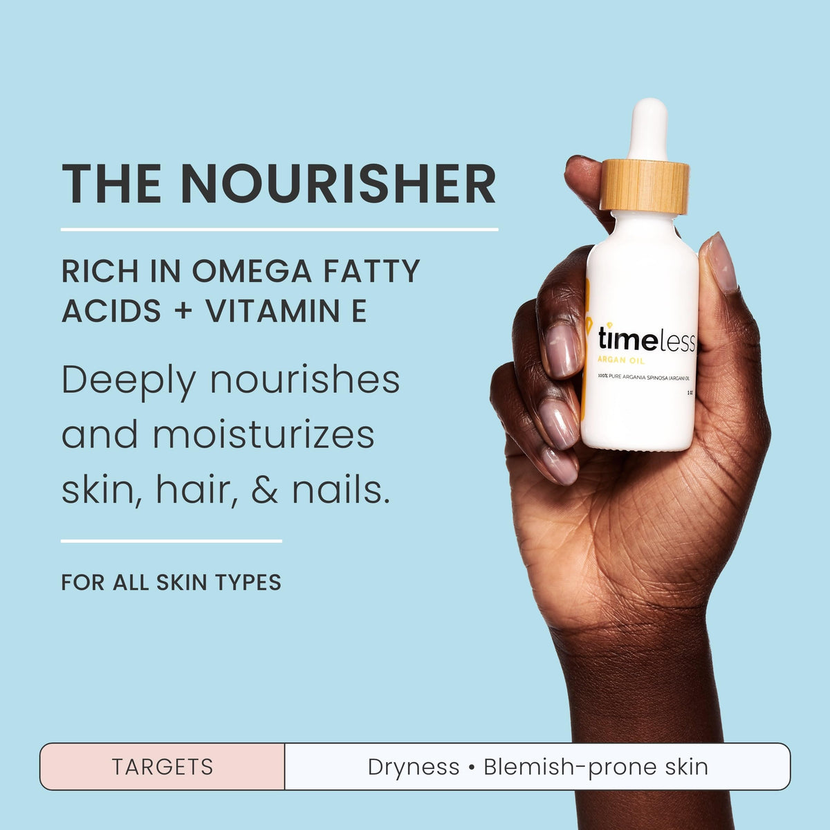 Nourish your skin and hair with Timeless Skin Care Argan Oil. This 100% pure argan oil is fragrance-free and perfect for dry skin, providing deep hydration and nourishment for both your face and hair.